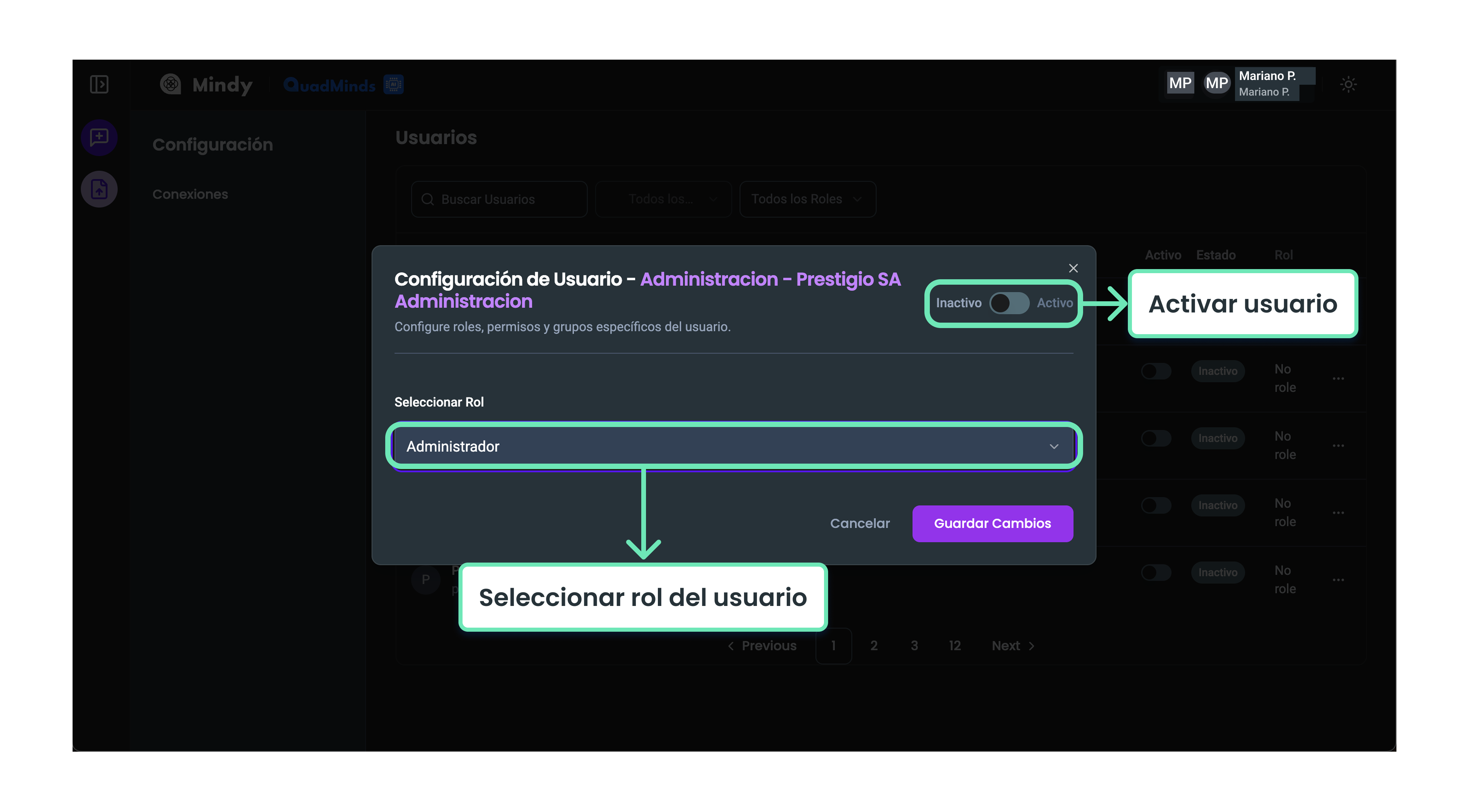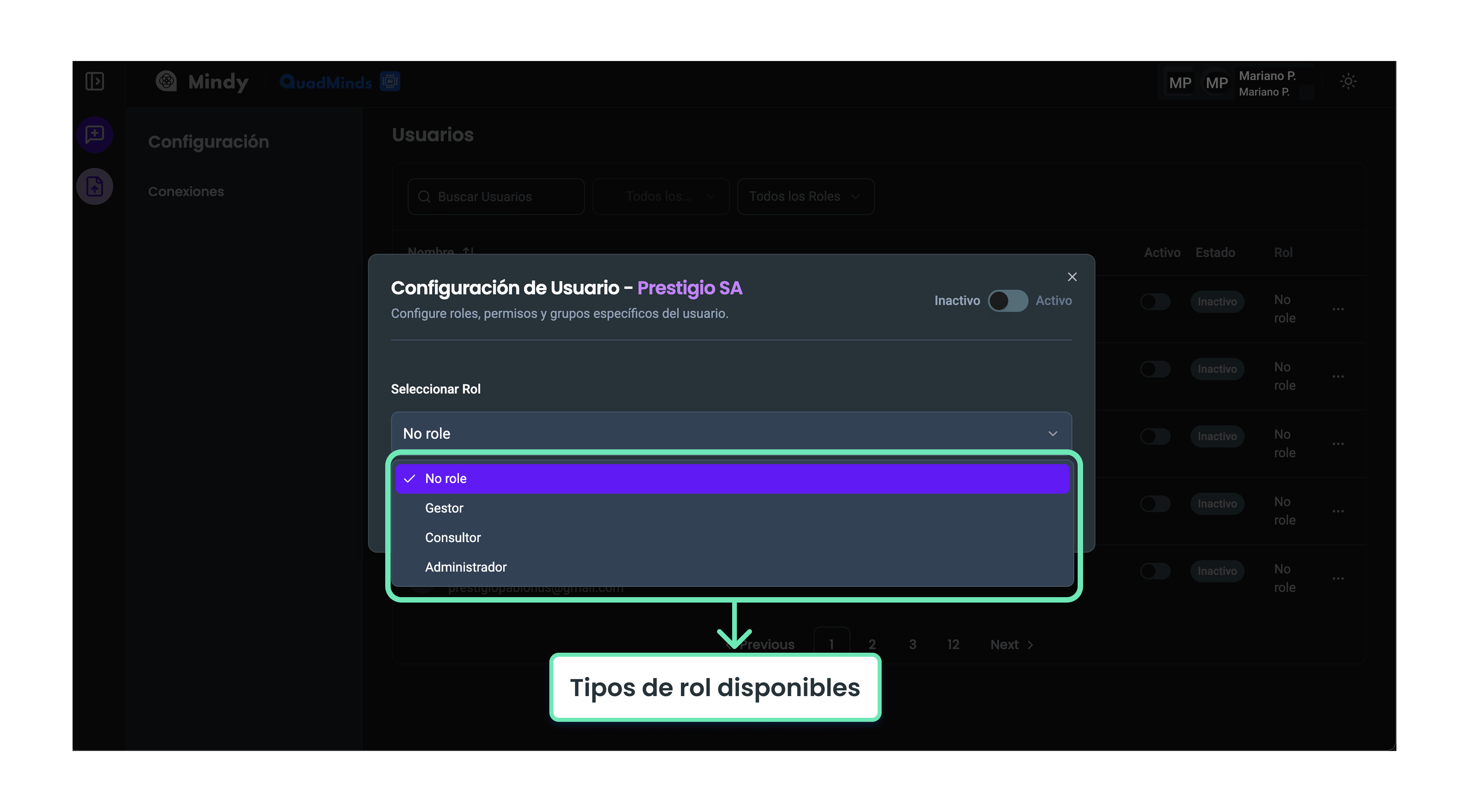 Administra usuarios, roles y conexiones externas de Mindy desde un único lugar.