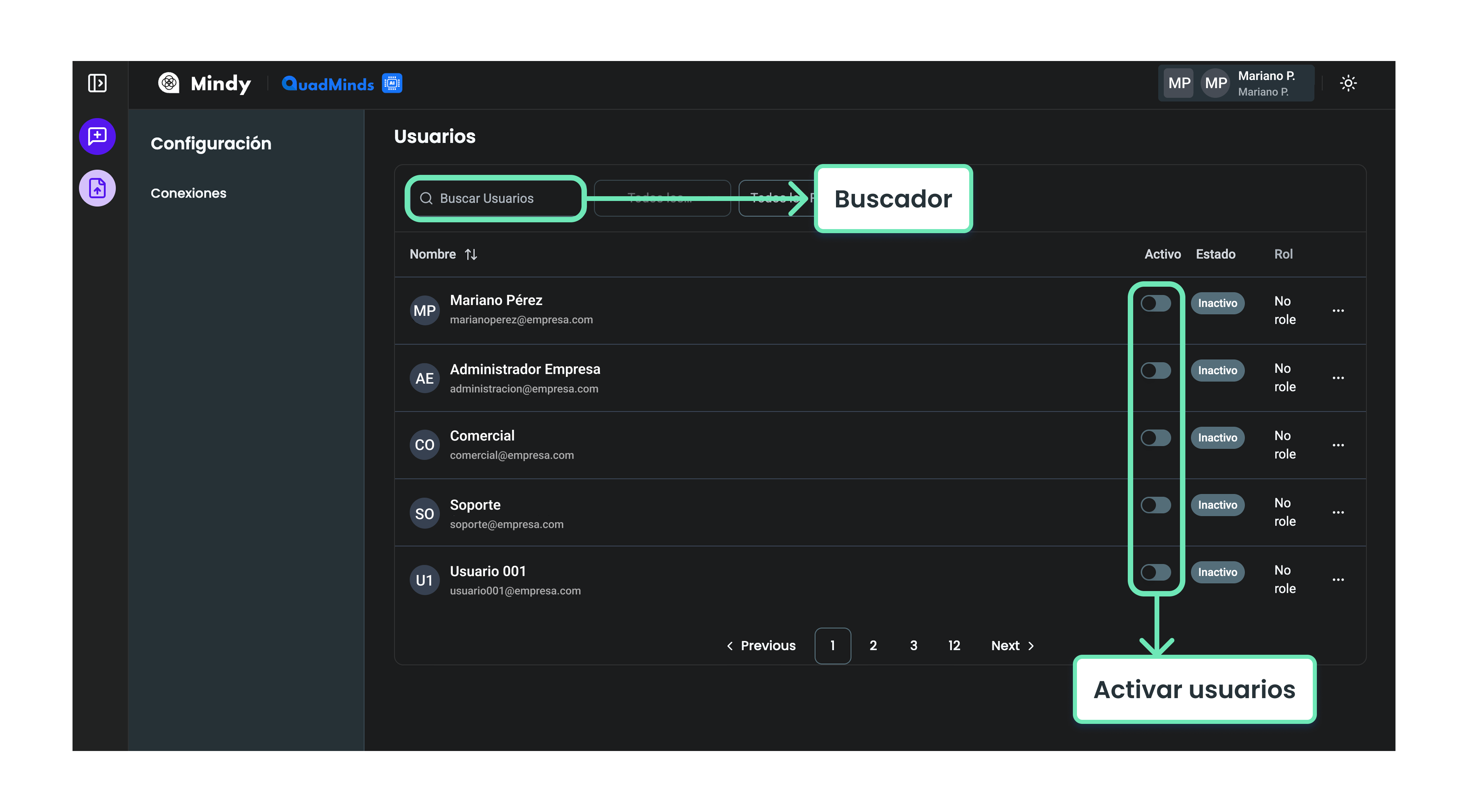 - Activar o desactivar usuarios desde el interruptor de estado.