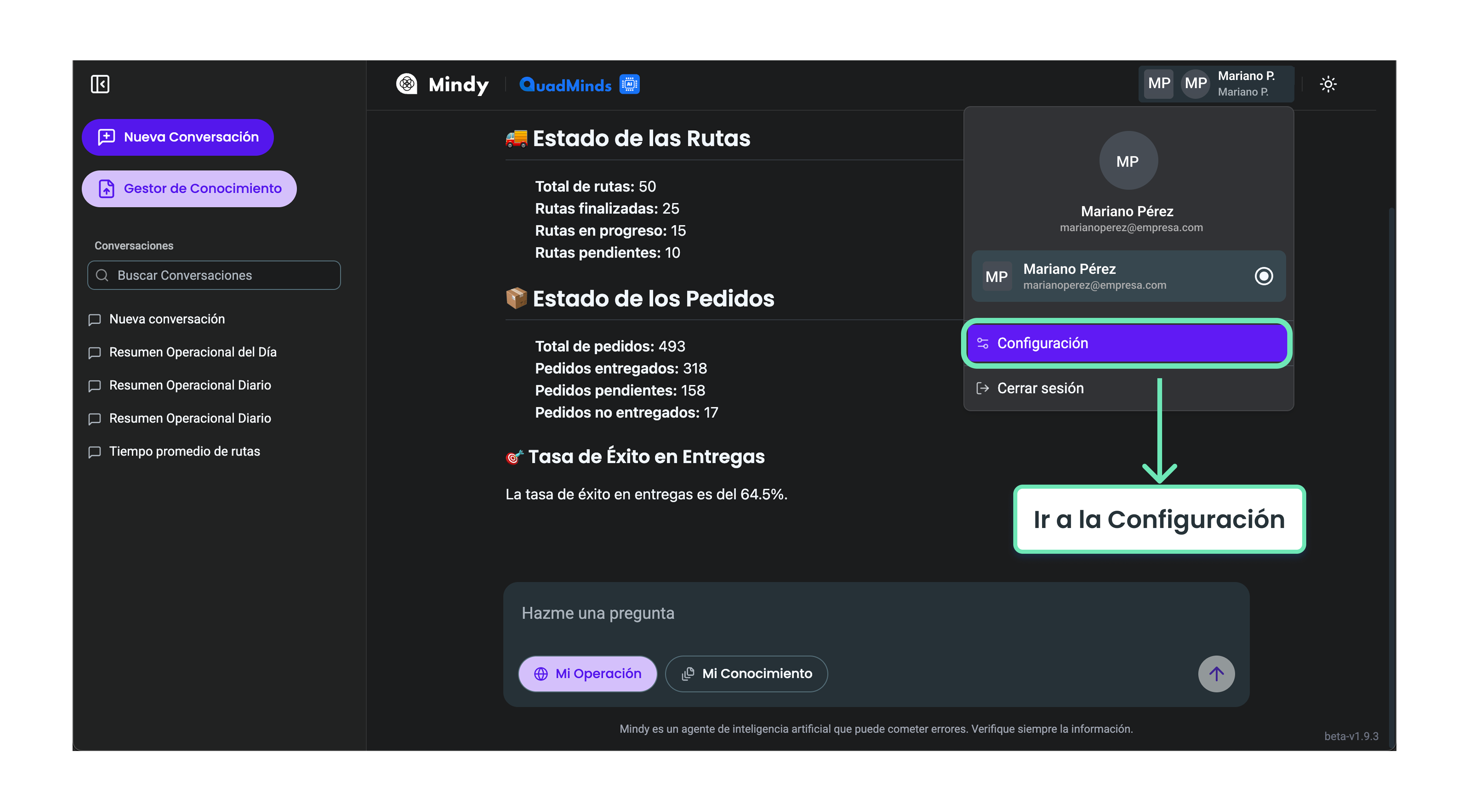 Para acceder a la Configuración debes hacer click en tu nombre, ubicado en la esquina superior derecha de la pantalla. Desde aquí podrás administrar usuarios, roles y conexiones externas.