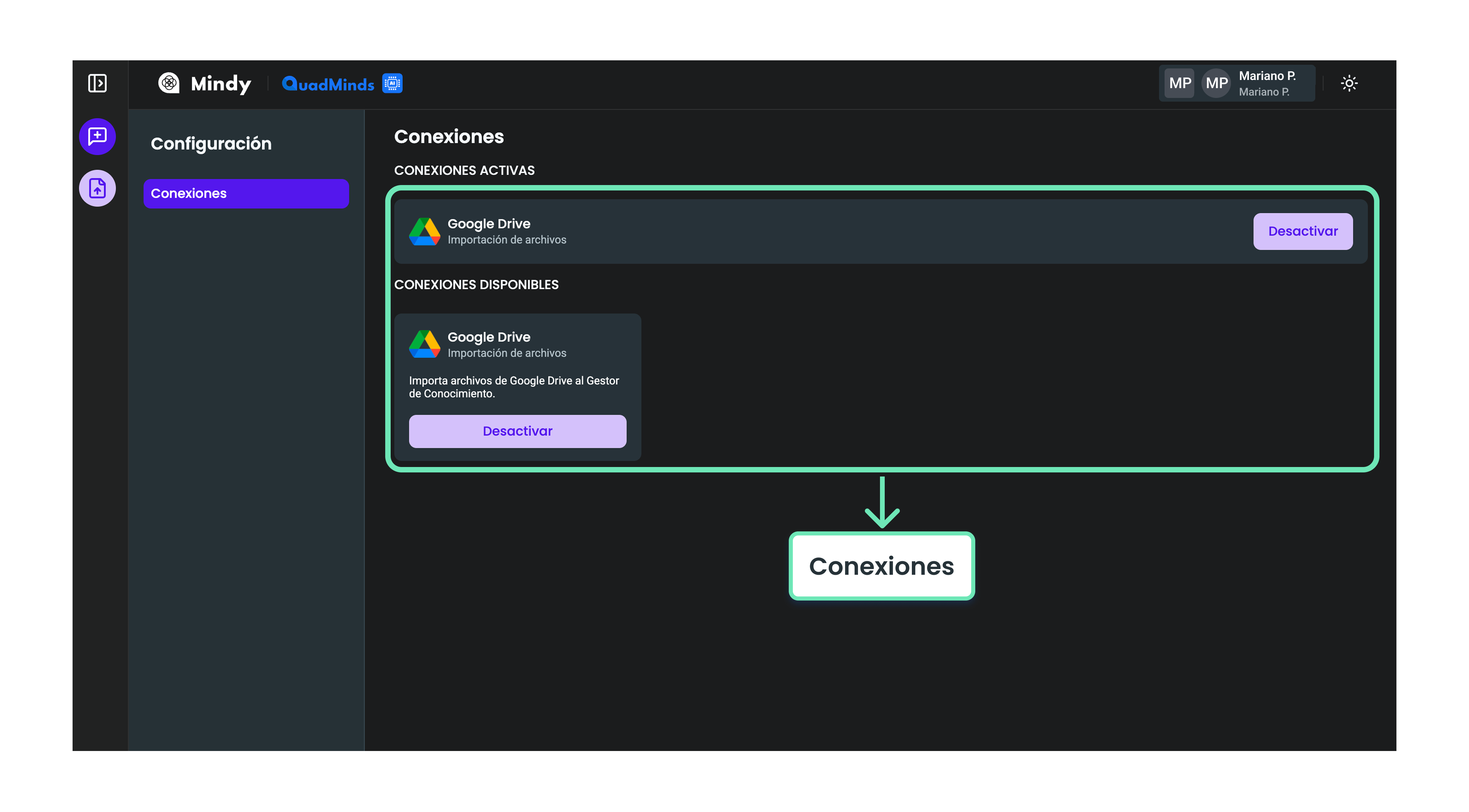 Actualmente está disponible la conexión con Google Drive, que permite importar archivos directamente al Gestor de Conocimiento.