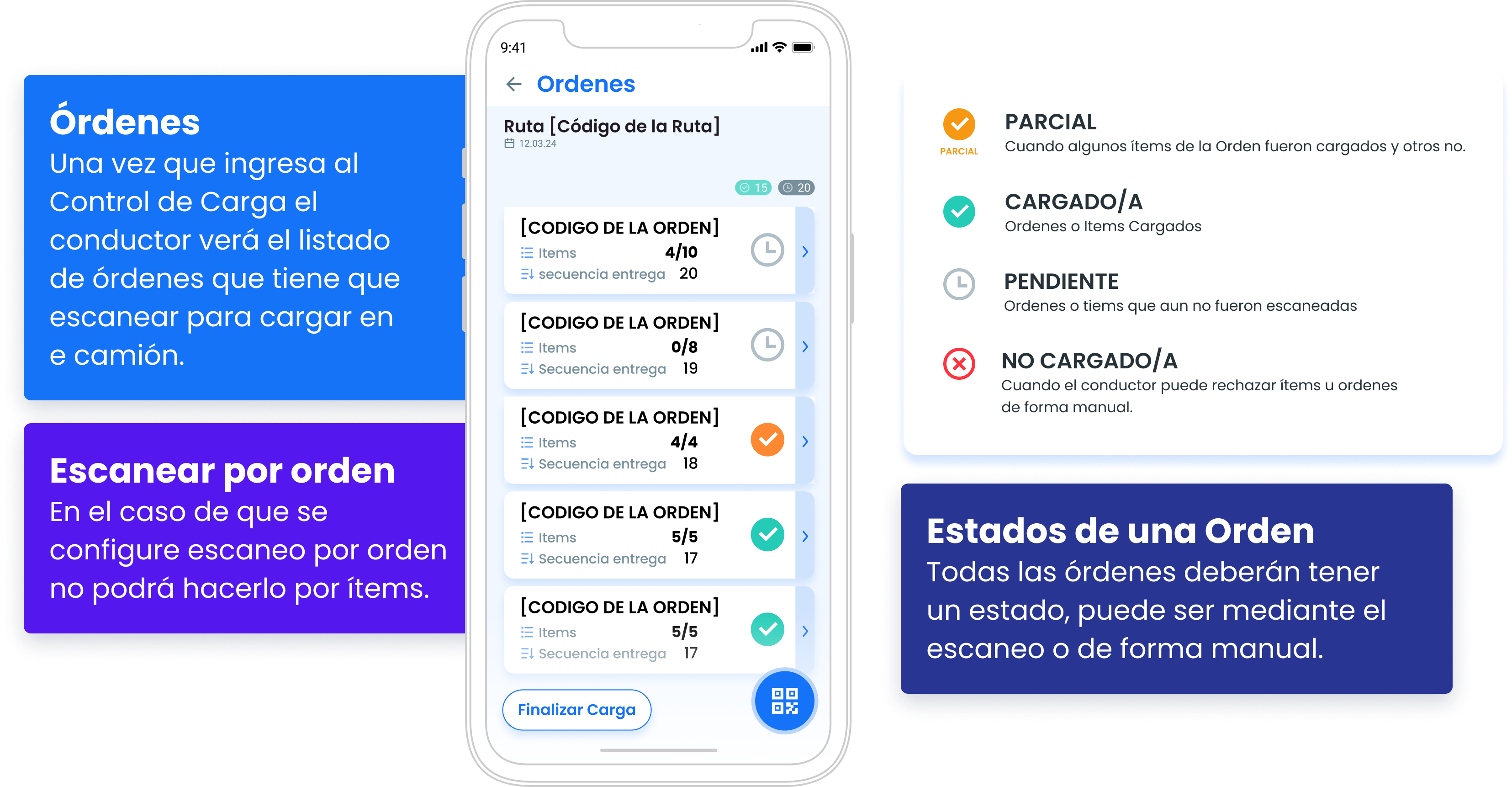 Las órdenes tendrán diferentes estados: parcial, cargada, pendiente y no cargada. Para finalizar el COntrol de Carga todas deberán tener un estado. Se escanean con la Driver App y en caso de no poder escanear alguna se podrá cargar de forma manual.