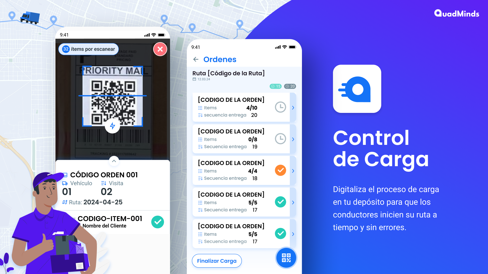 Desde Driver app, los conductores escanean los códigos de barra de cada orden o bulto y se les informa el detalle de la orden, el nombre de la Ruta y el vehículo asignados y el orden de visita al punto de entrega.