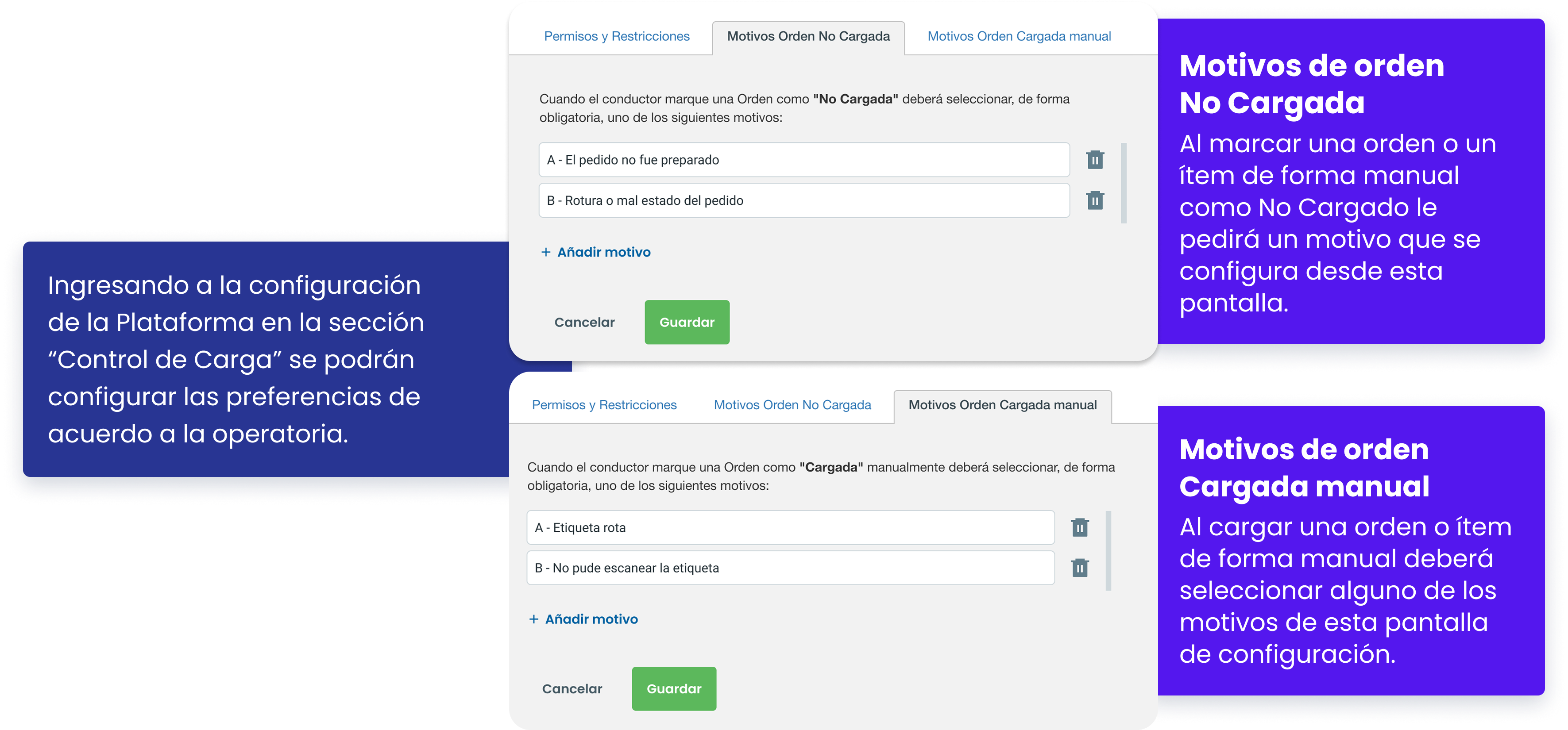 Los Motivos que se configuran desde la Plataforma son los mismos que le aparecerán en la Driver App al conductor cuando no pueda cargar una orden o la tenga que cargar manualmente.