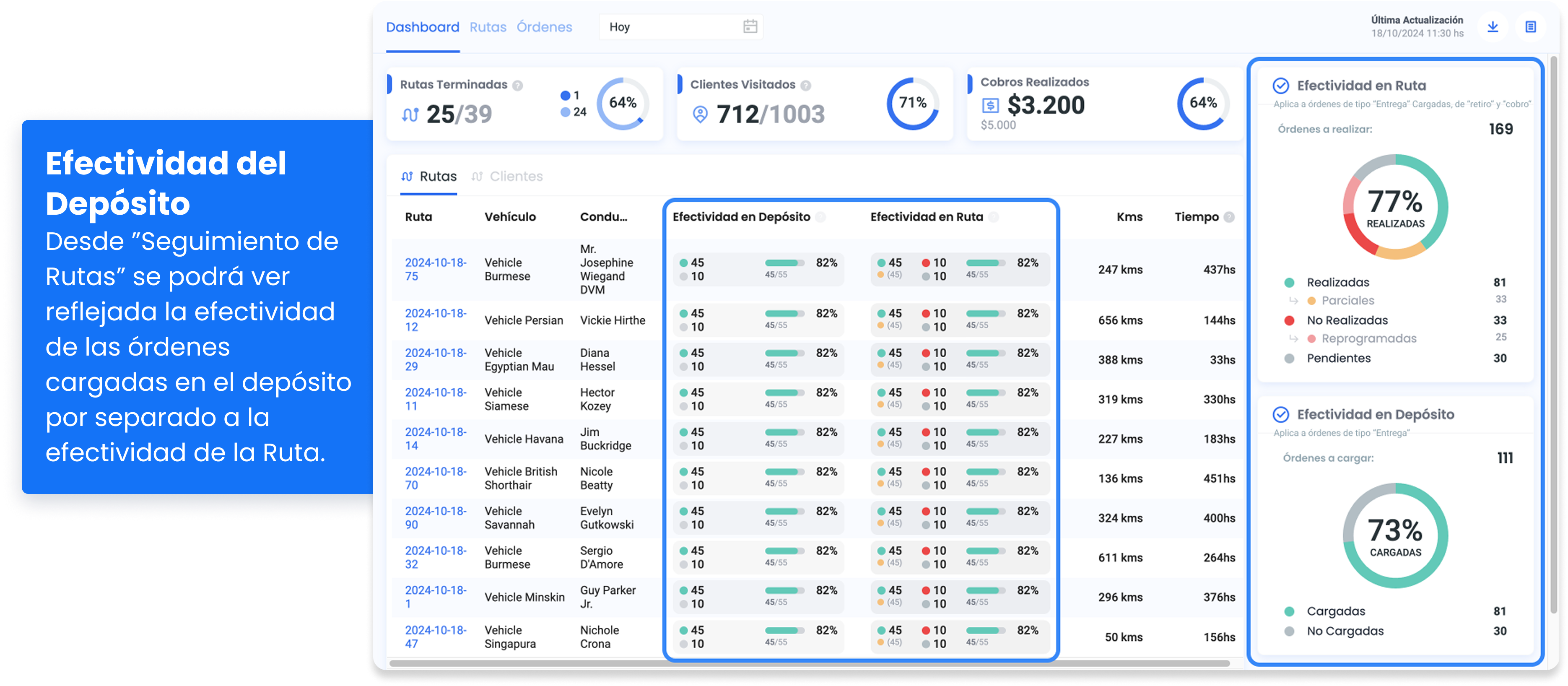 Desde la Funcionalidad Seguimiento de Rutas, en el Dashboard, se podrá ver la Efectividad en Depósito, eso refleja la actividad del conductor desde la App con Control de Carga.