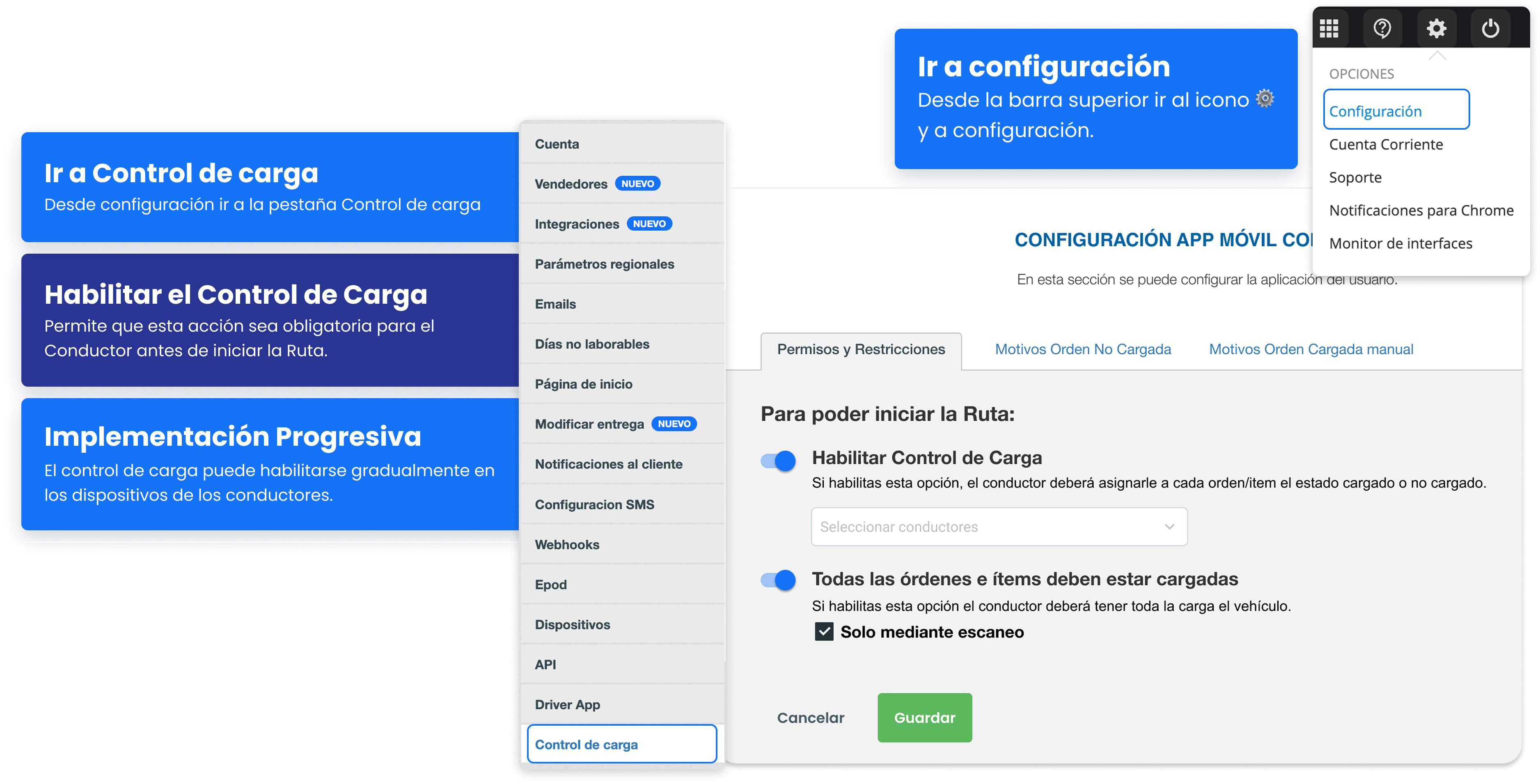 Lo primero que hay que hacer es configurar desde la Plataforma para que la Driver App tenga la funcionalidad Control de Carga activada.