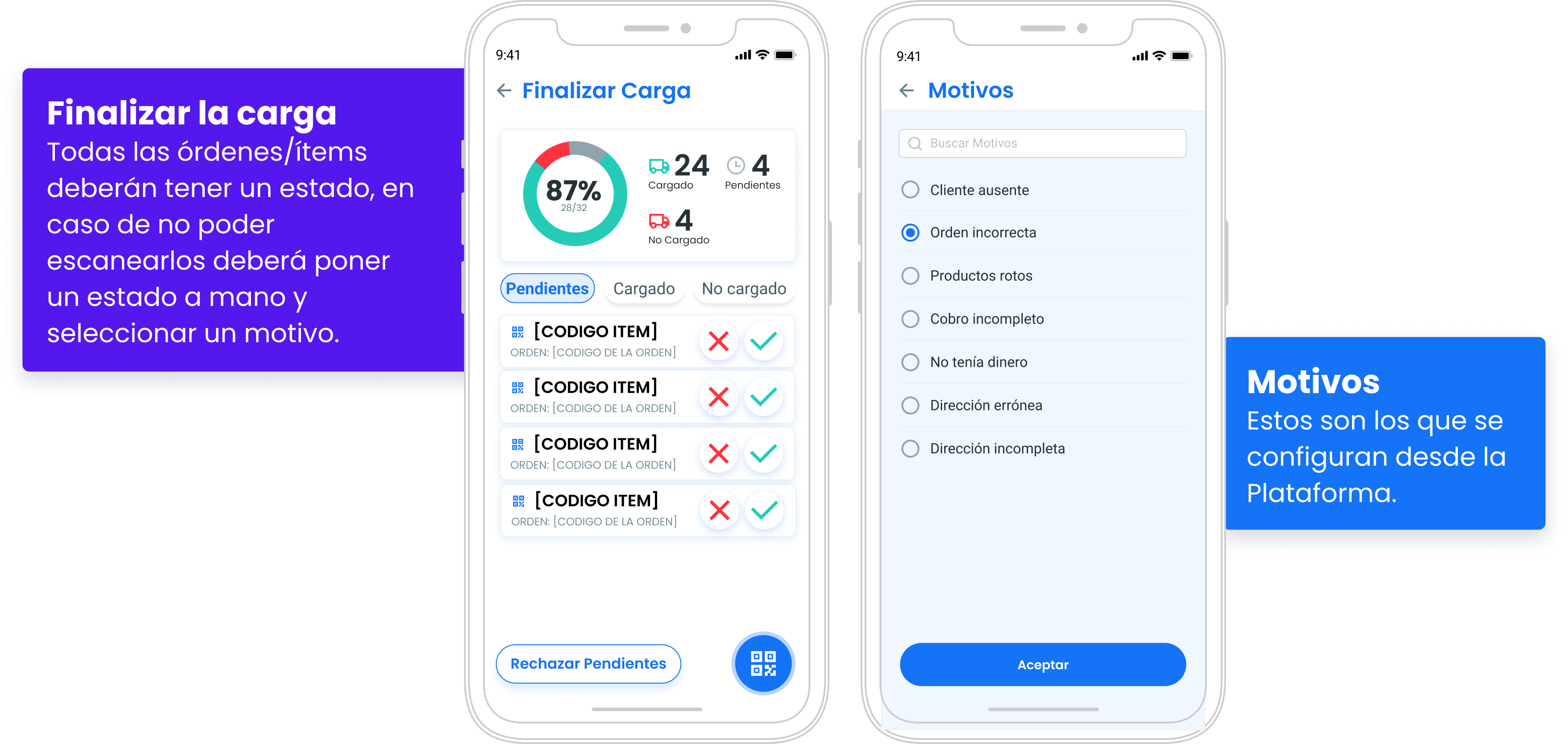En el caso de que una etiqueta no esté en condiciones de ser escaneada, el conductor podrá marcar, a mano, la orden o bulto como Cargada o No cargada y registrar el motivo.
