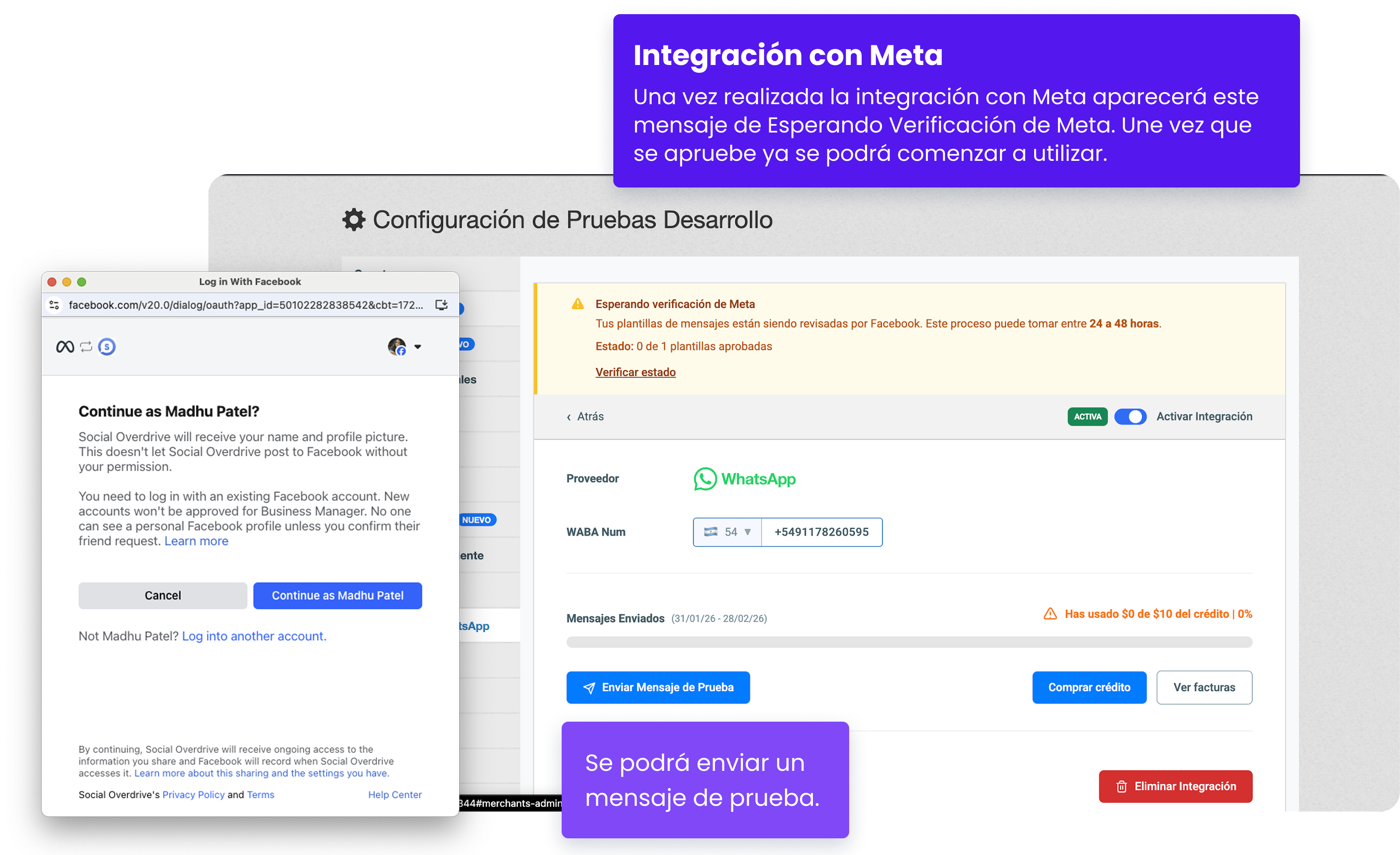 Se abrirá un modal para hacer la conexión con Meta y se deberán seguir los pasos: