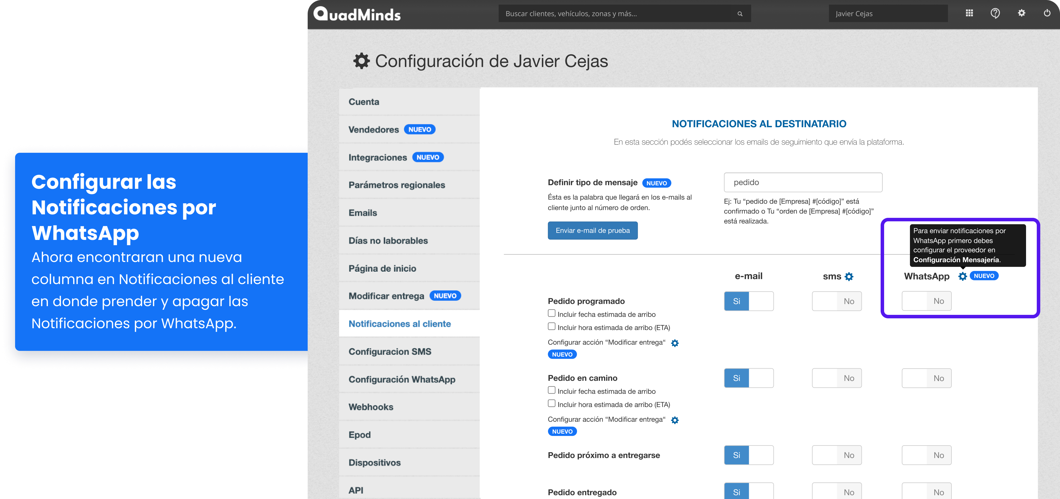 Seleccione las Notificaciones que quiera que le lleguen al cliente y enciendalas: