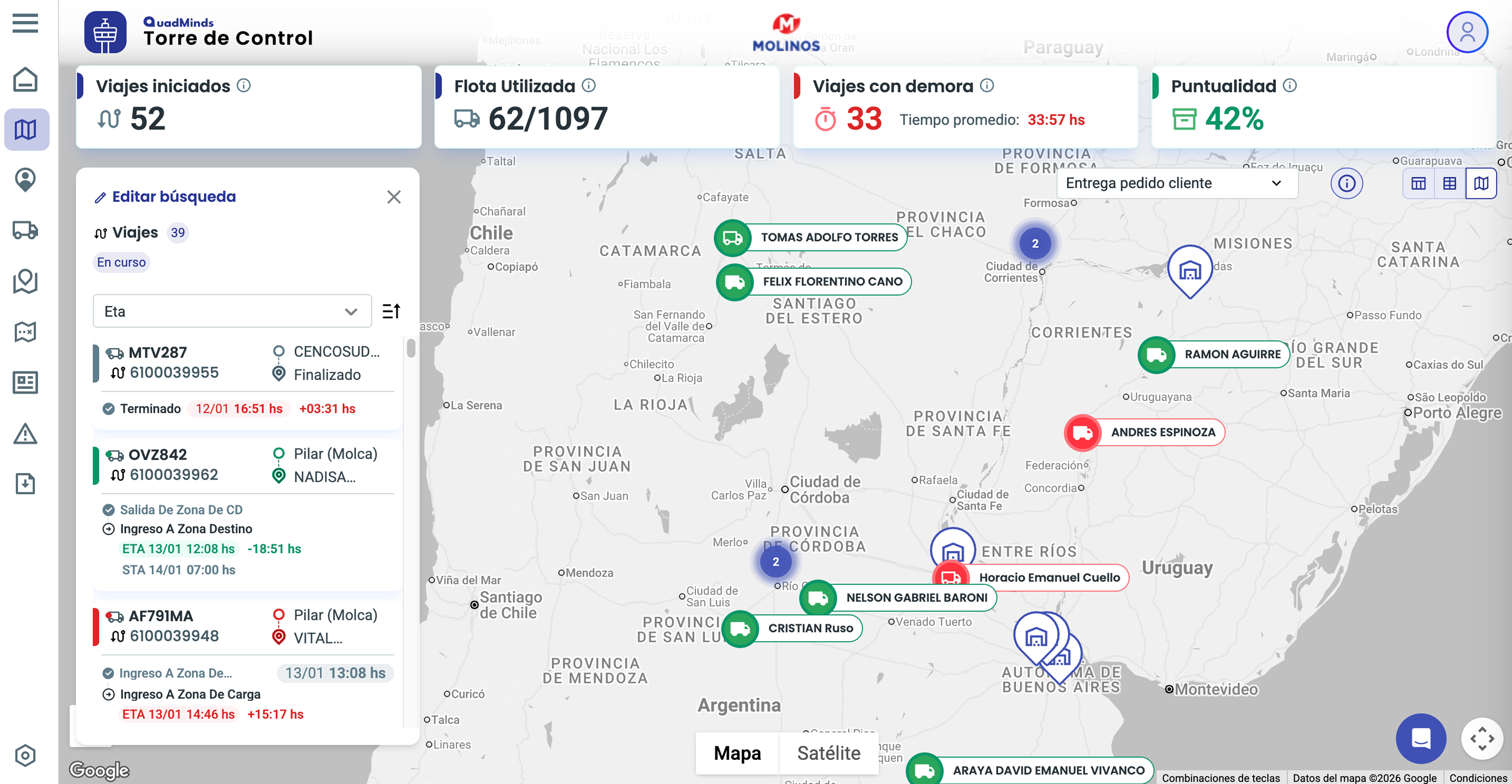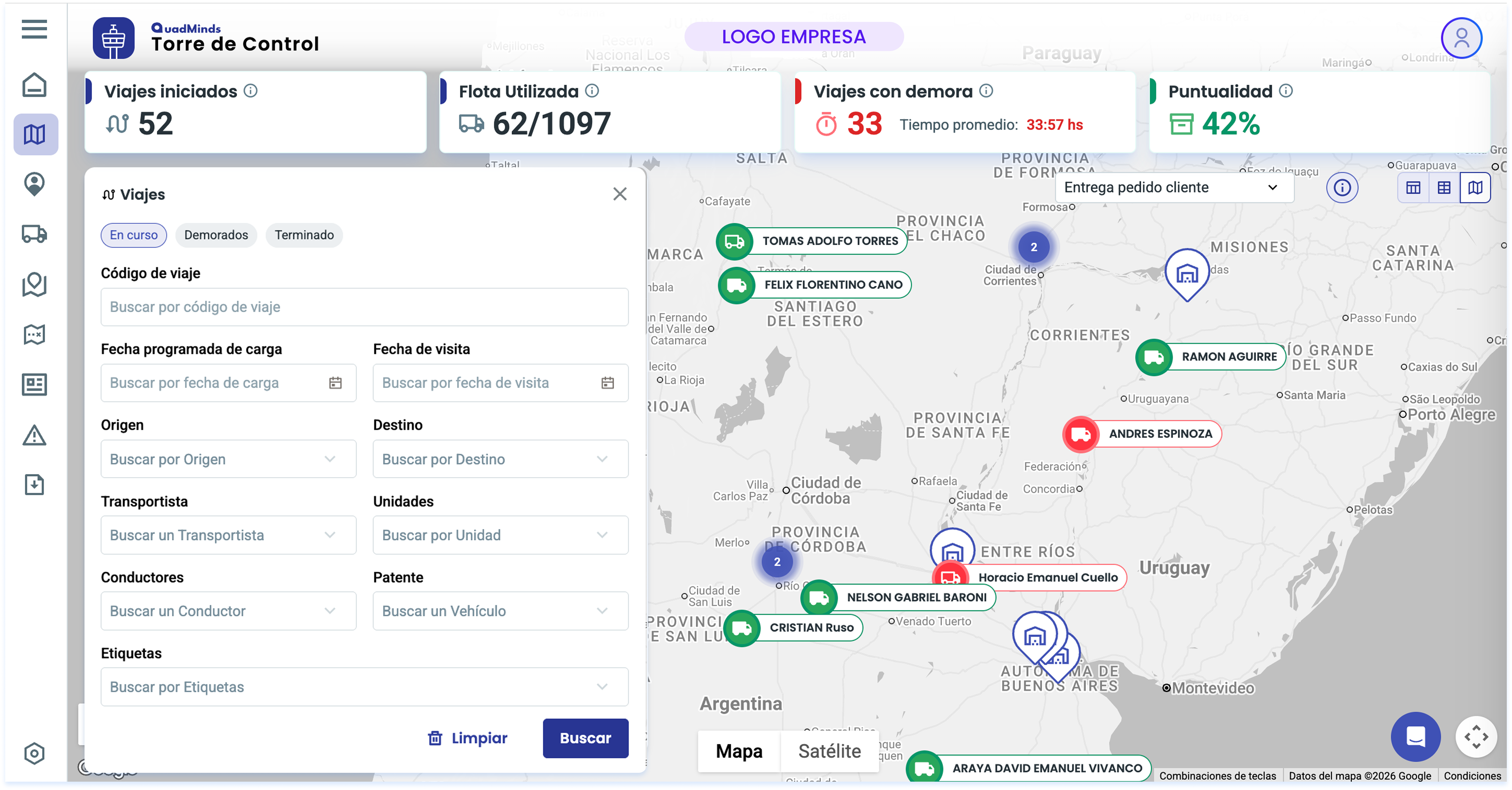 Esta funcionalidad está centralizada en ver todos los viajes que están sucediendo dentro del rango determinado en el buscador, de acuerdo a los filtros aplicados.