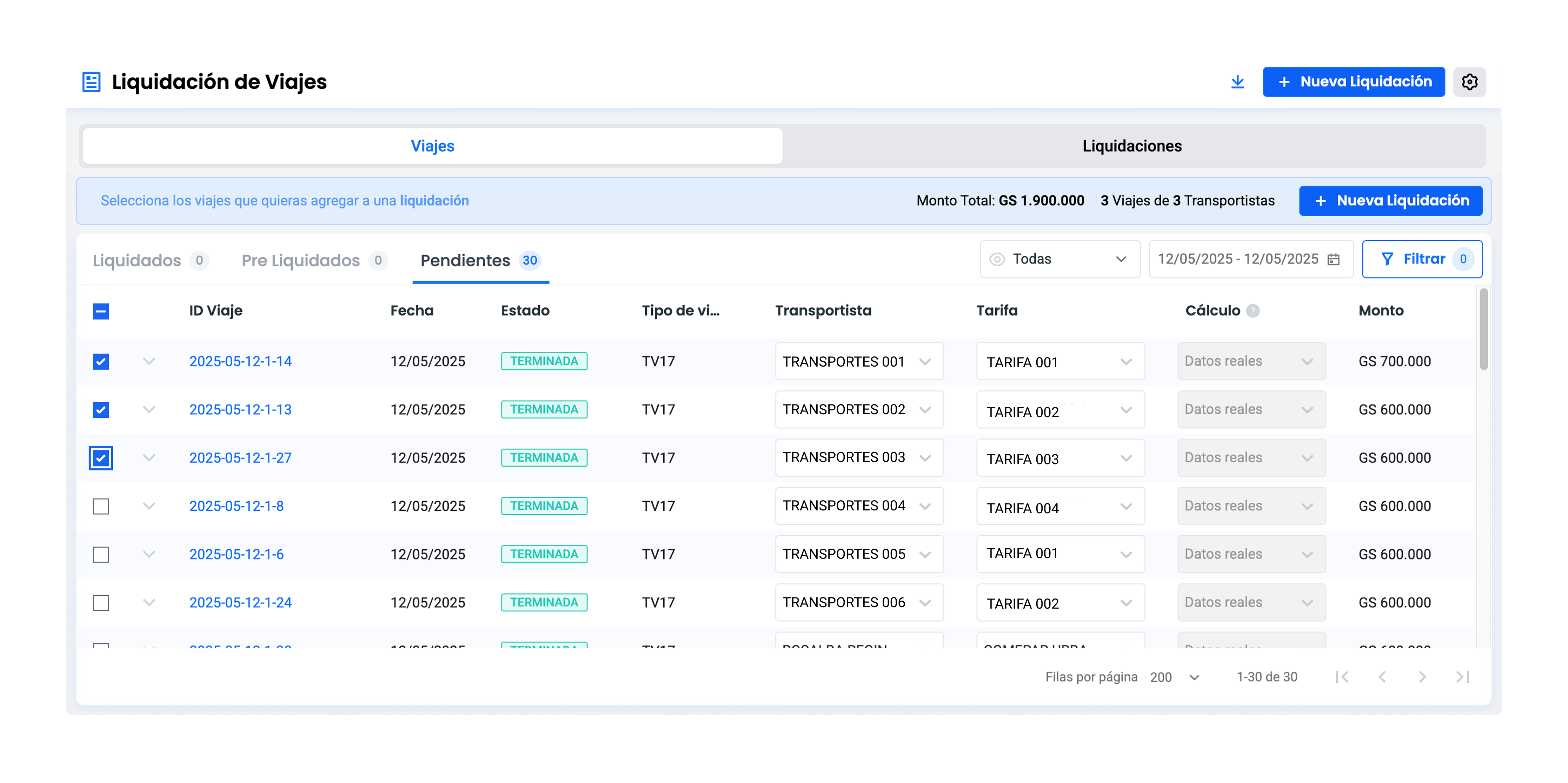 Desde el listado de viajes, en la tab pendientes, se seleccionan los viajes que a liquidar a través del checkbox. Pudiendo listarlos por rango de fechas (maximo 2 meses) y también usando los filtros. Se podrán seleccionar viajes de distintos transportistas que luego se guardaran individualmente.
