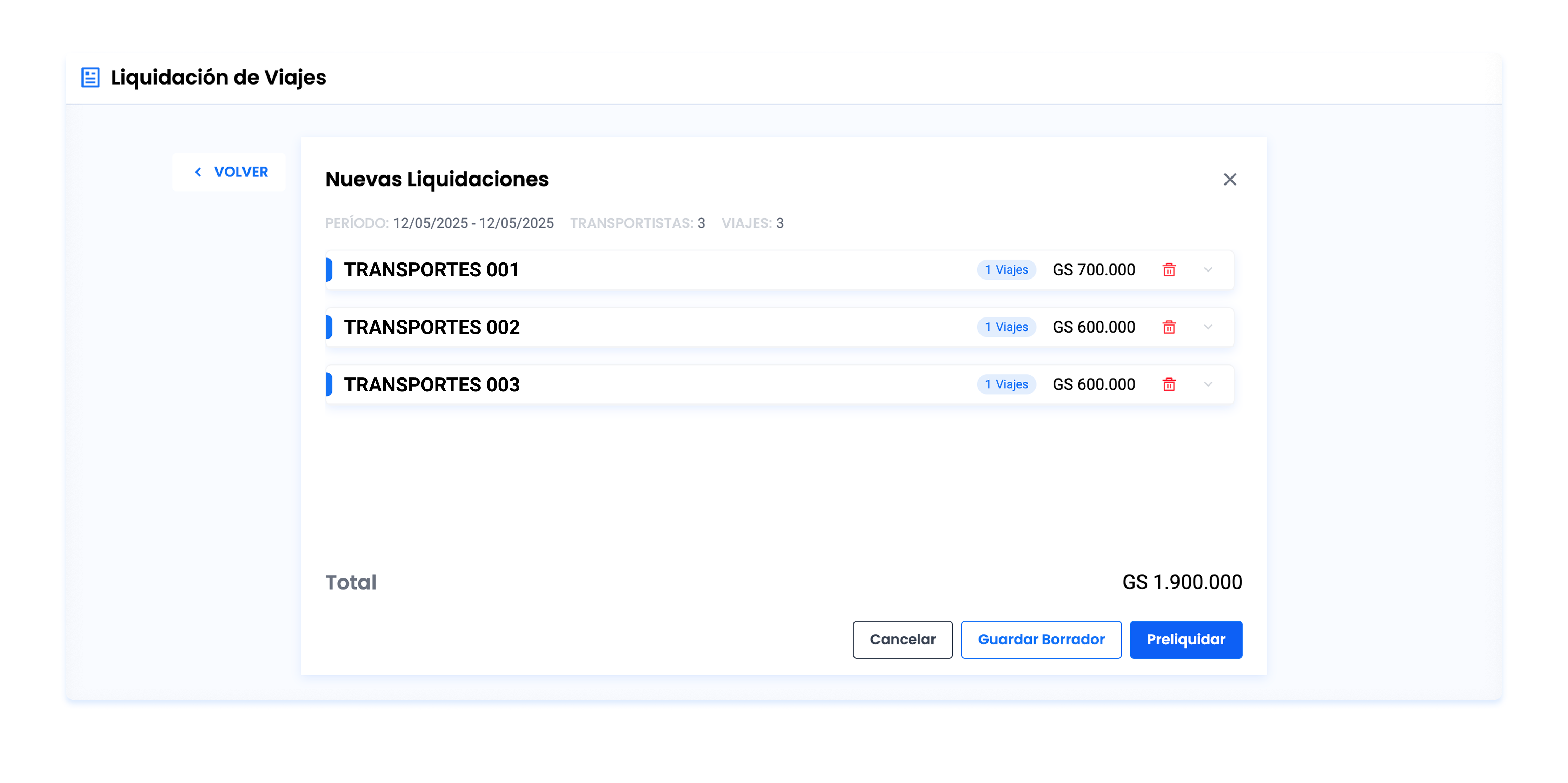 Una vez seleccionados los viajes, se generará un resumen de la selección con el botón de nueva liquidación. Al presionar traerá los viajes con los parámetros establecidos, agrupados por transportista y le permitirá borrar alguno que no desee en esa pre-liquidación.