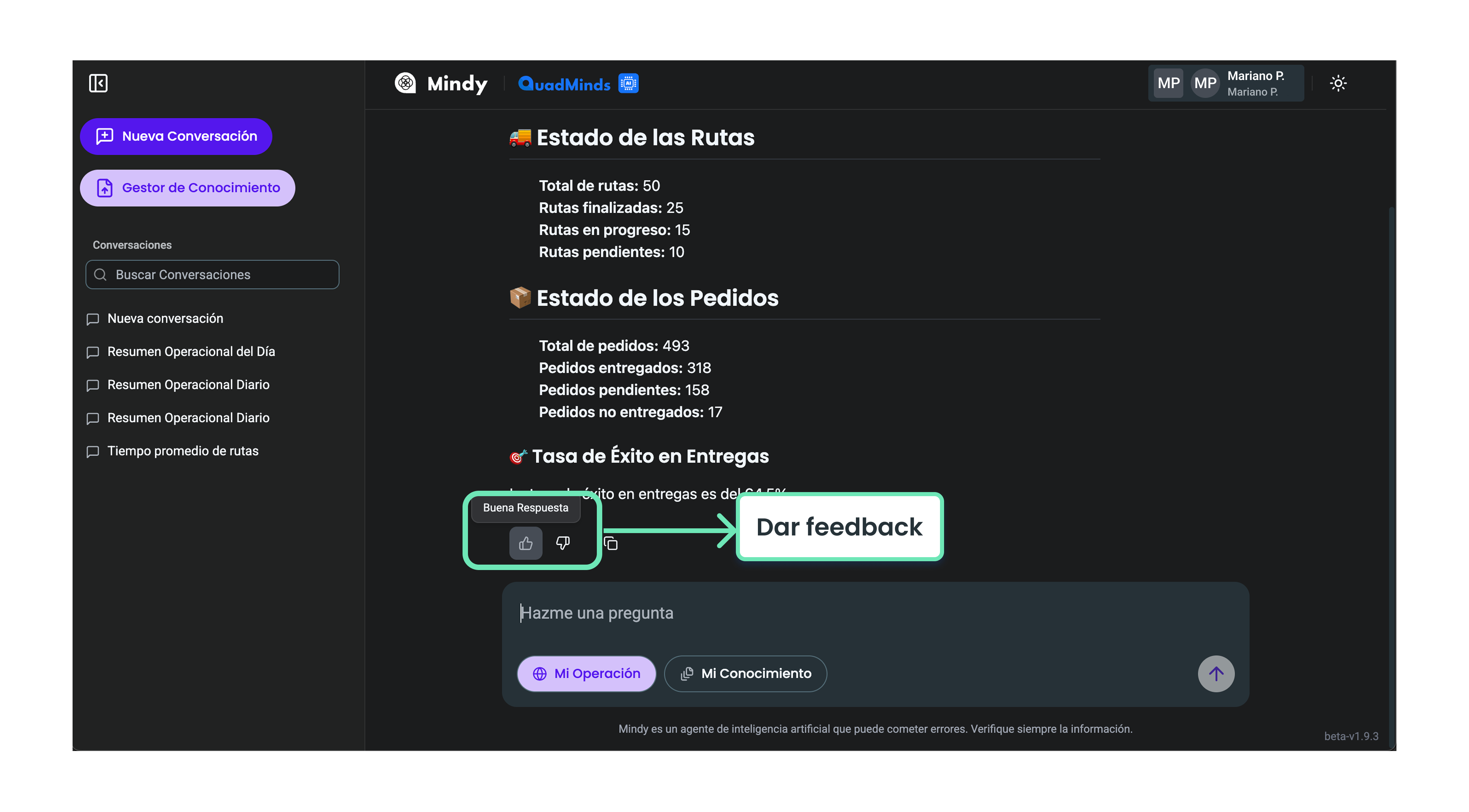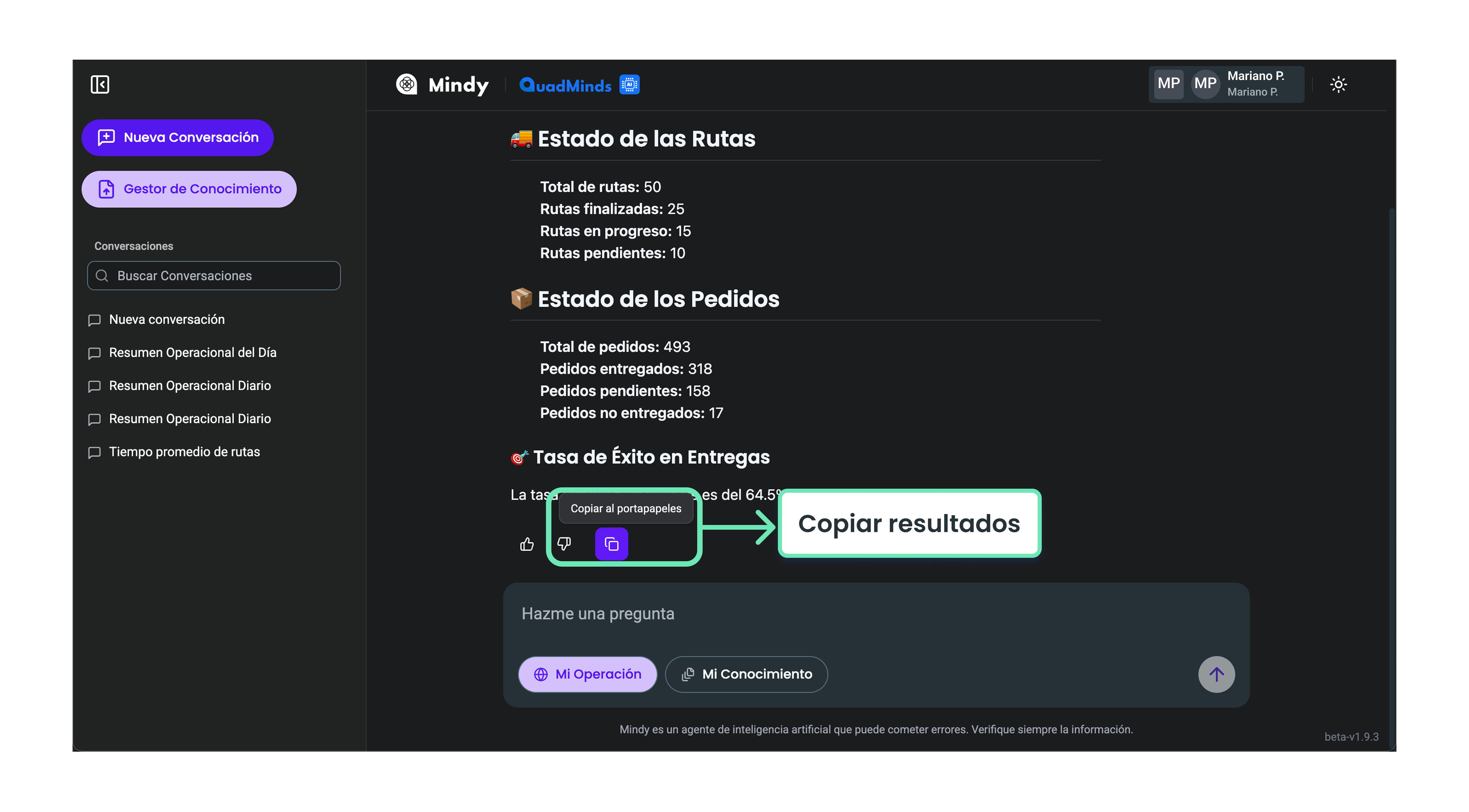 Además de las funcionalidades específicas de Mi Operación y Mi Conocimiento, Mindy ofrece herramientas que te ayudan a organizar y reutilizar tus interacciones.