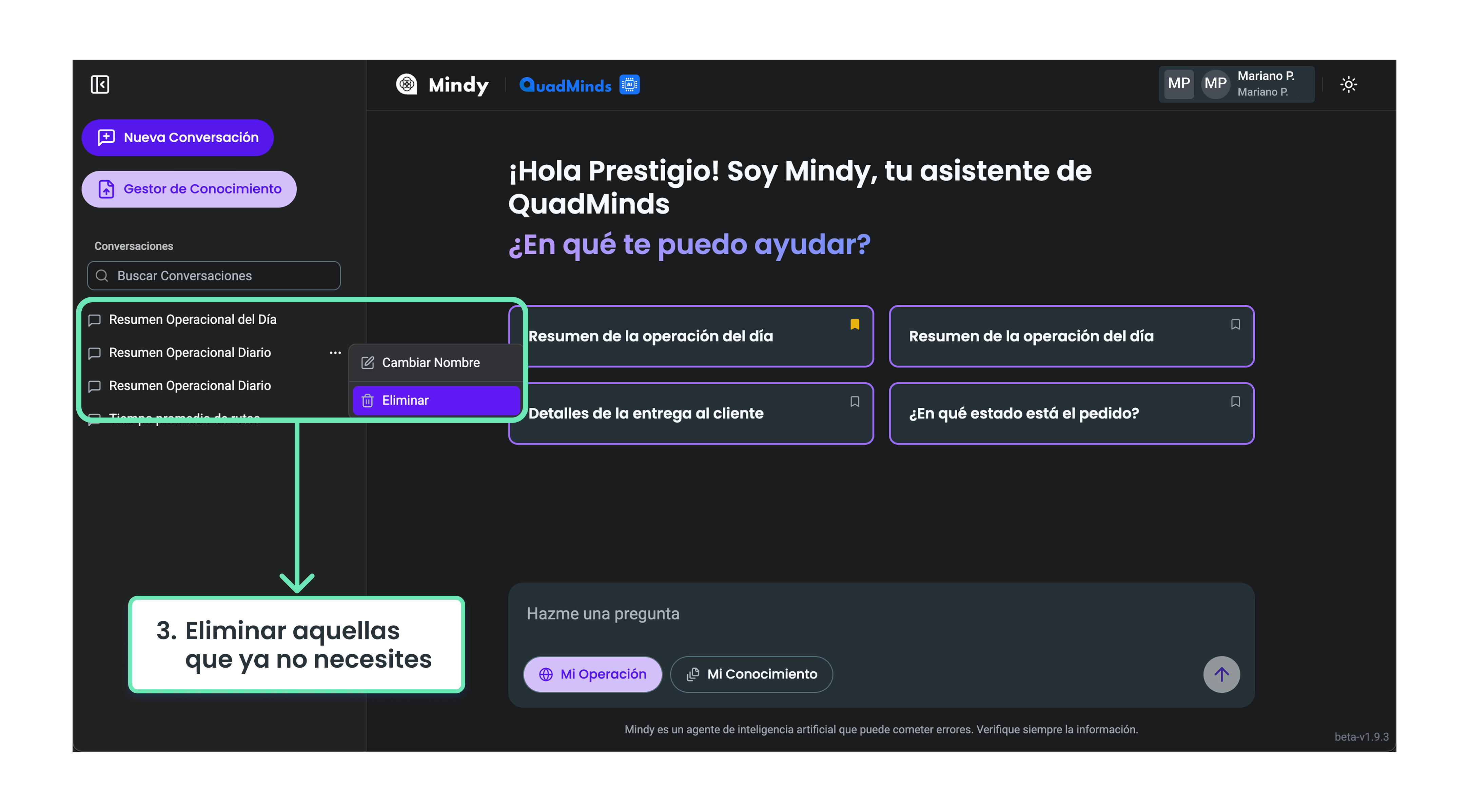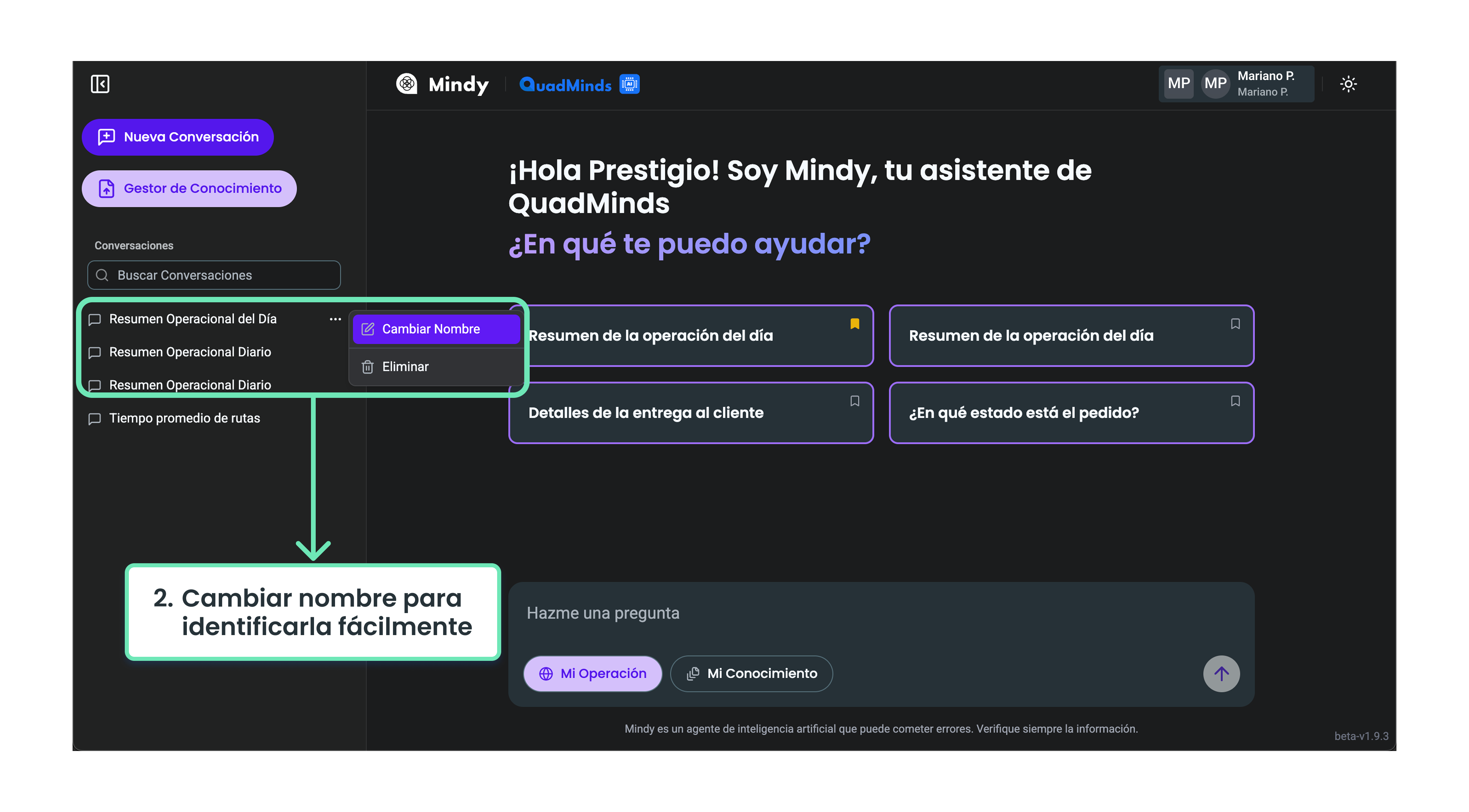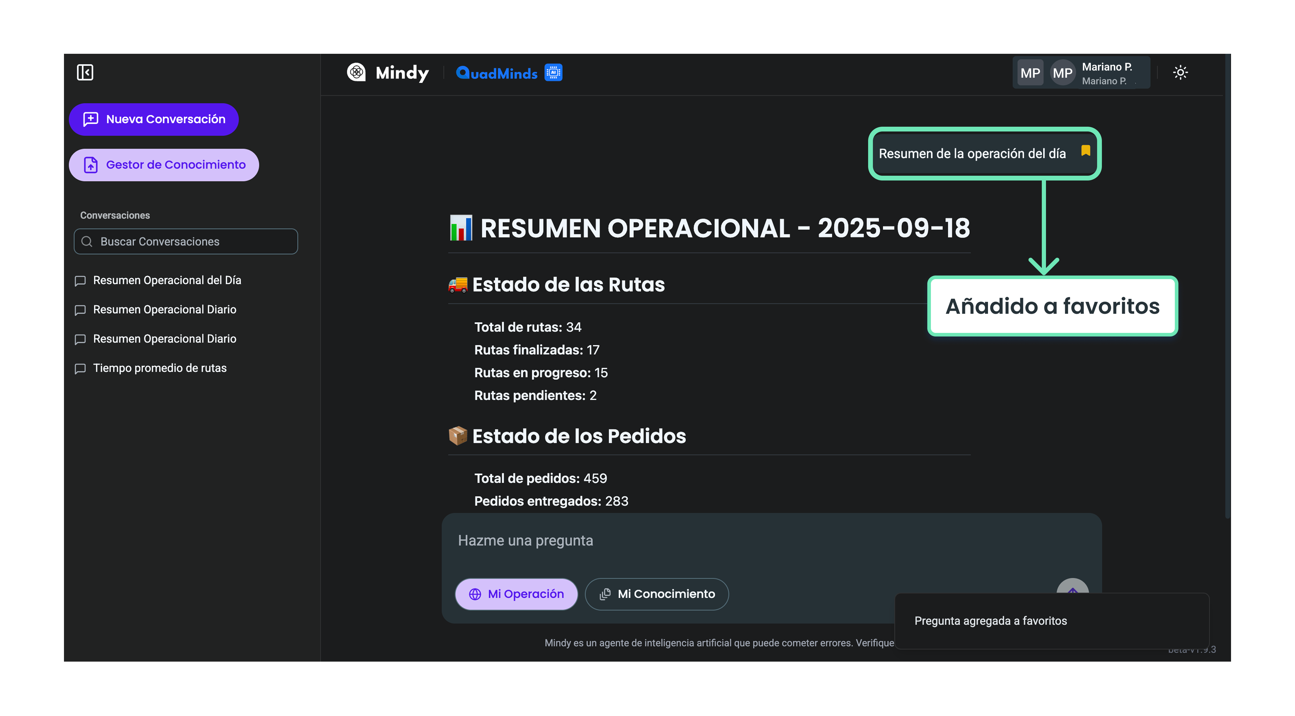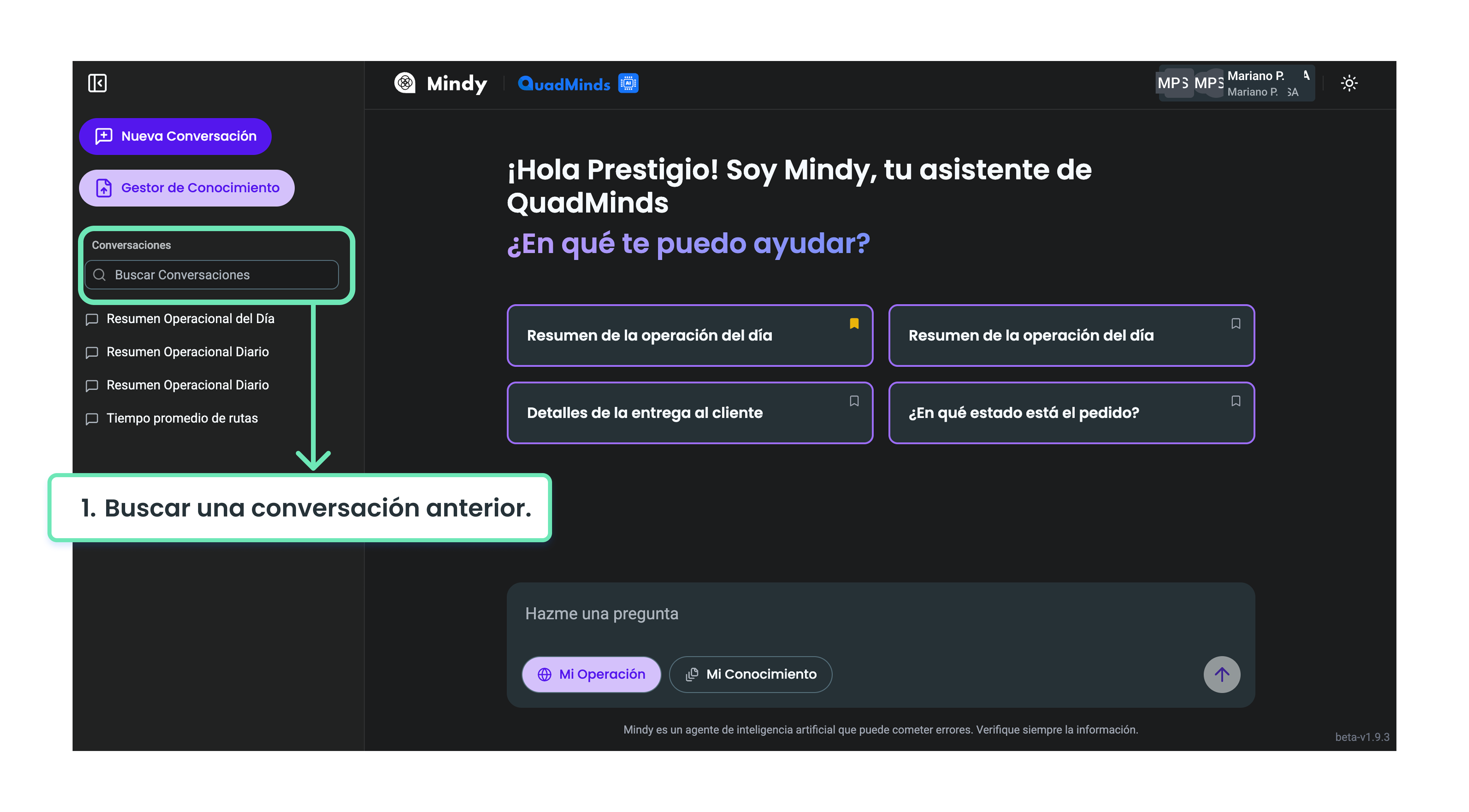 Además de las funcionalidades específicas de Mi Operación y Mi Conocimiento, Mindy ofrece herramientas que te ayudan a organizar y reutilizar tus interacciones.