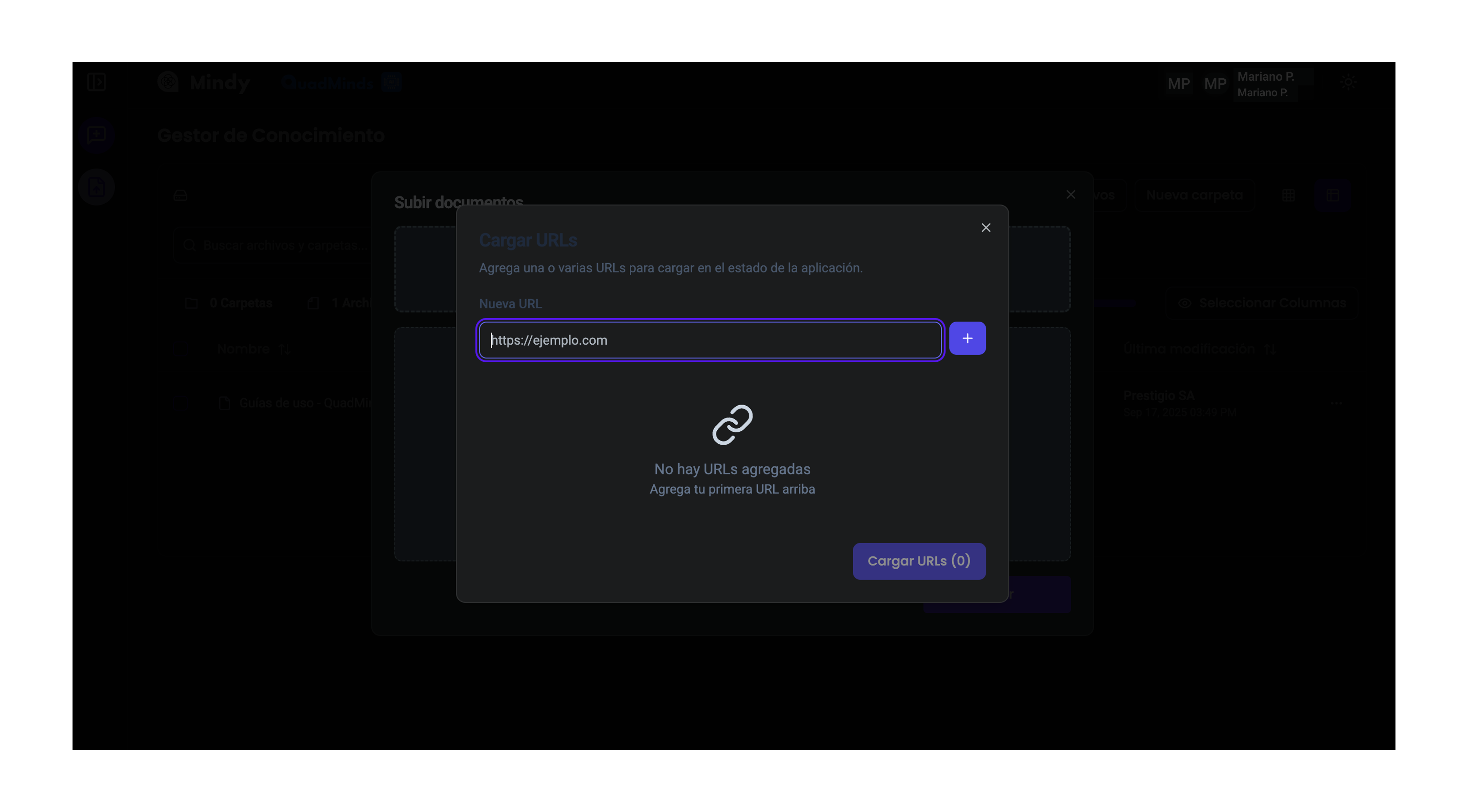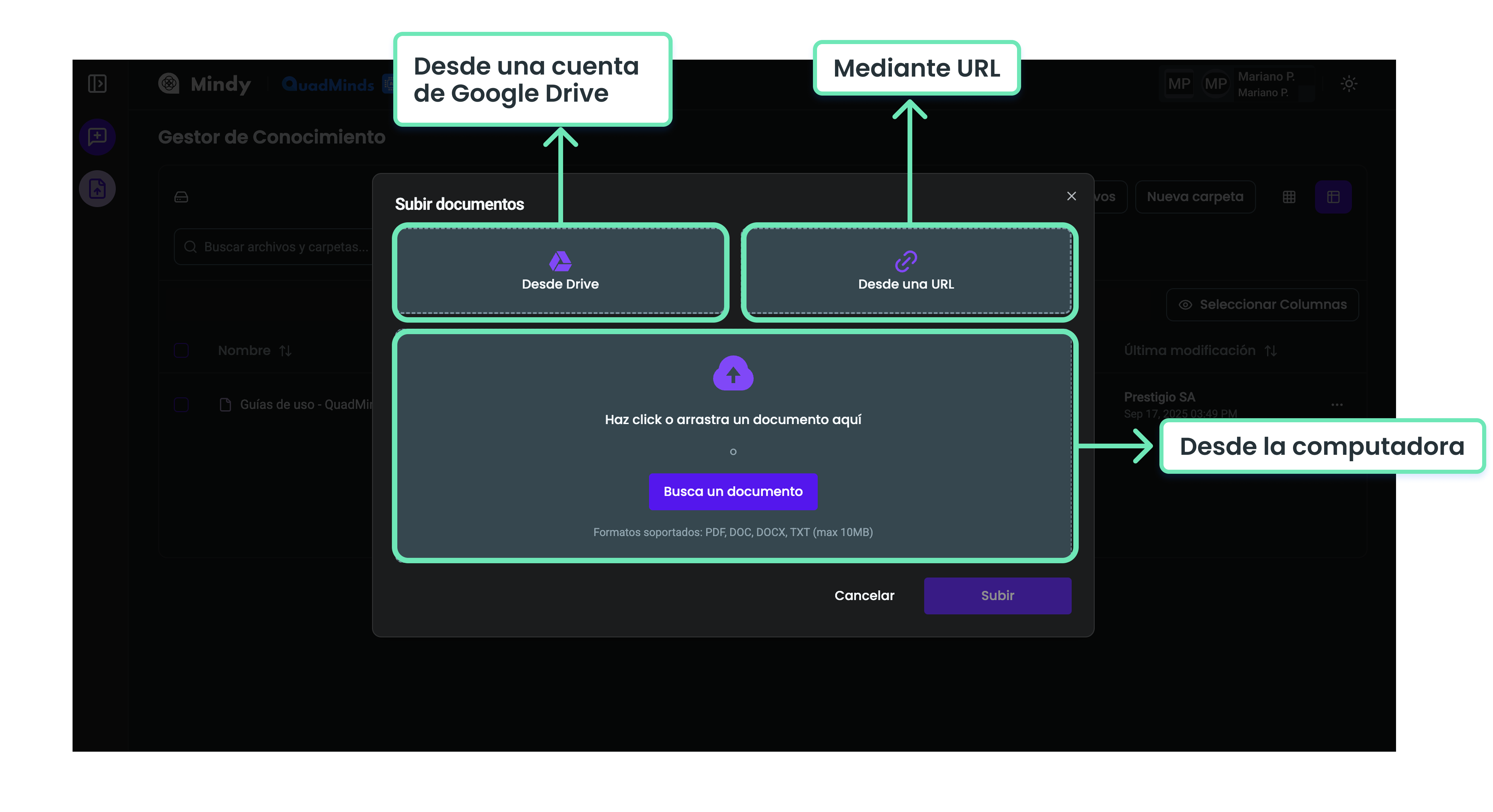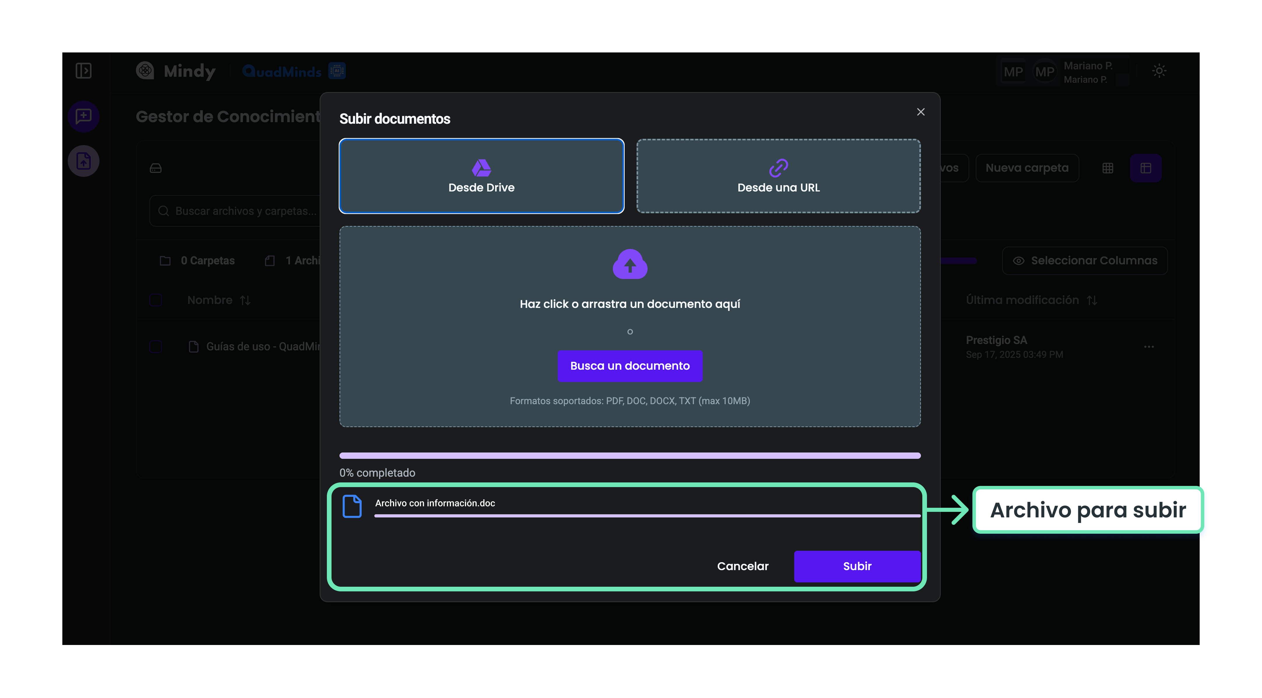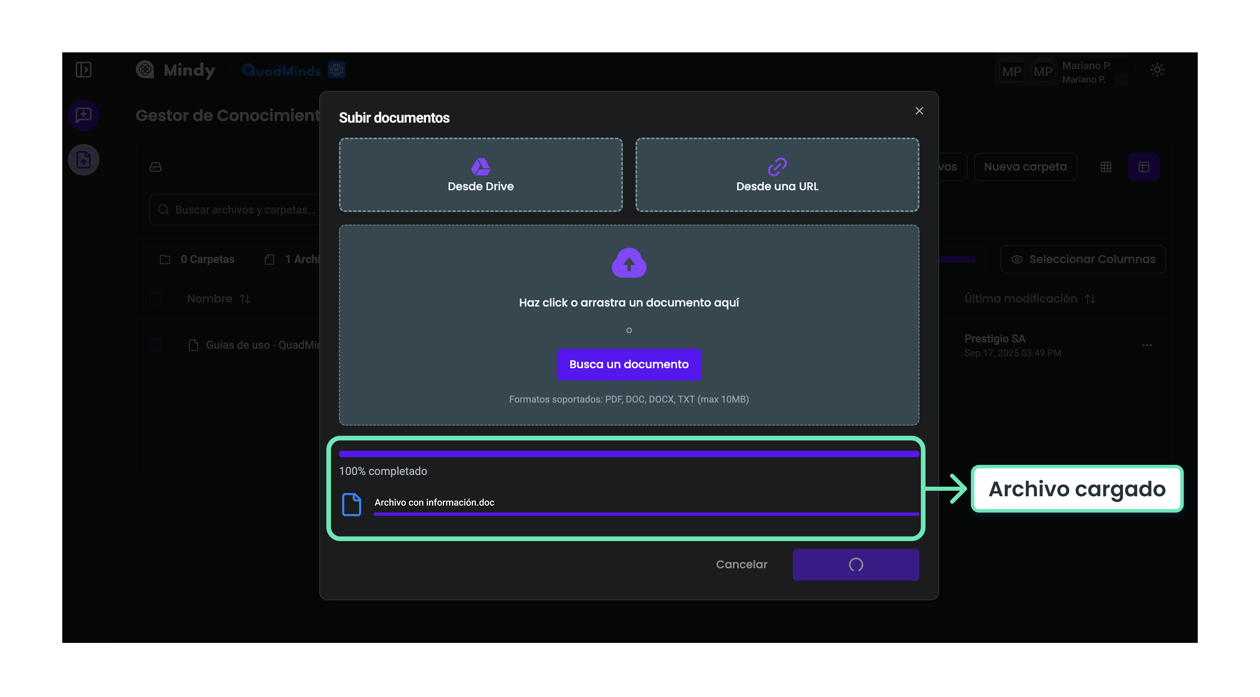 Para que los documentos estén disponibles en Mindy y puedan ser consultados, primero deben cargarse en la plataforma.