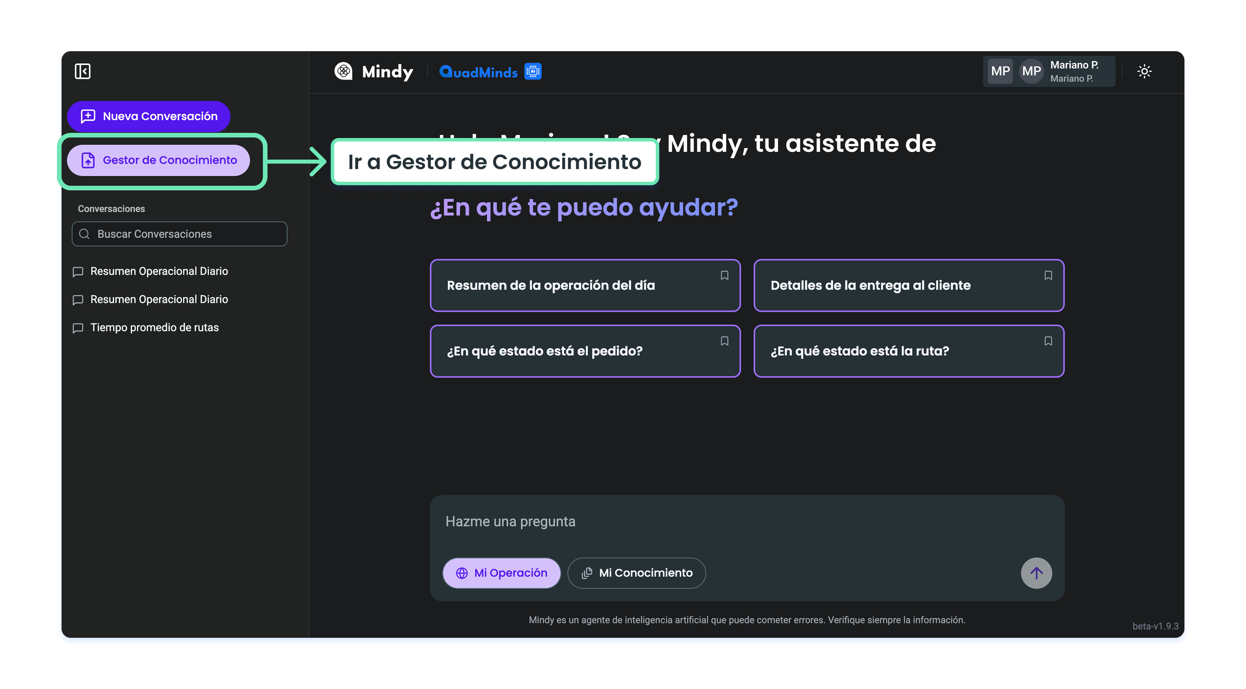 Para utilizar Mi Conocimiento, simplemente debes hacer click en el botón correspondiente y comenzar a preguntar. Mindy te proporcionará toda la información pertinente al tema de tu consulta, siempre y cuando dicha información se encuentre en la documentación disponible en la plataforma.