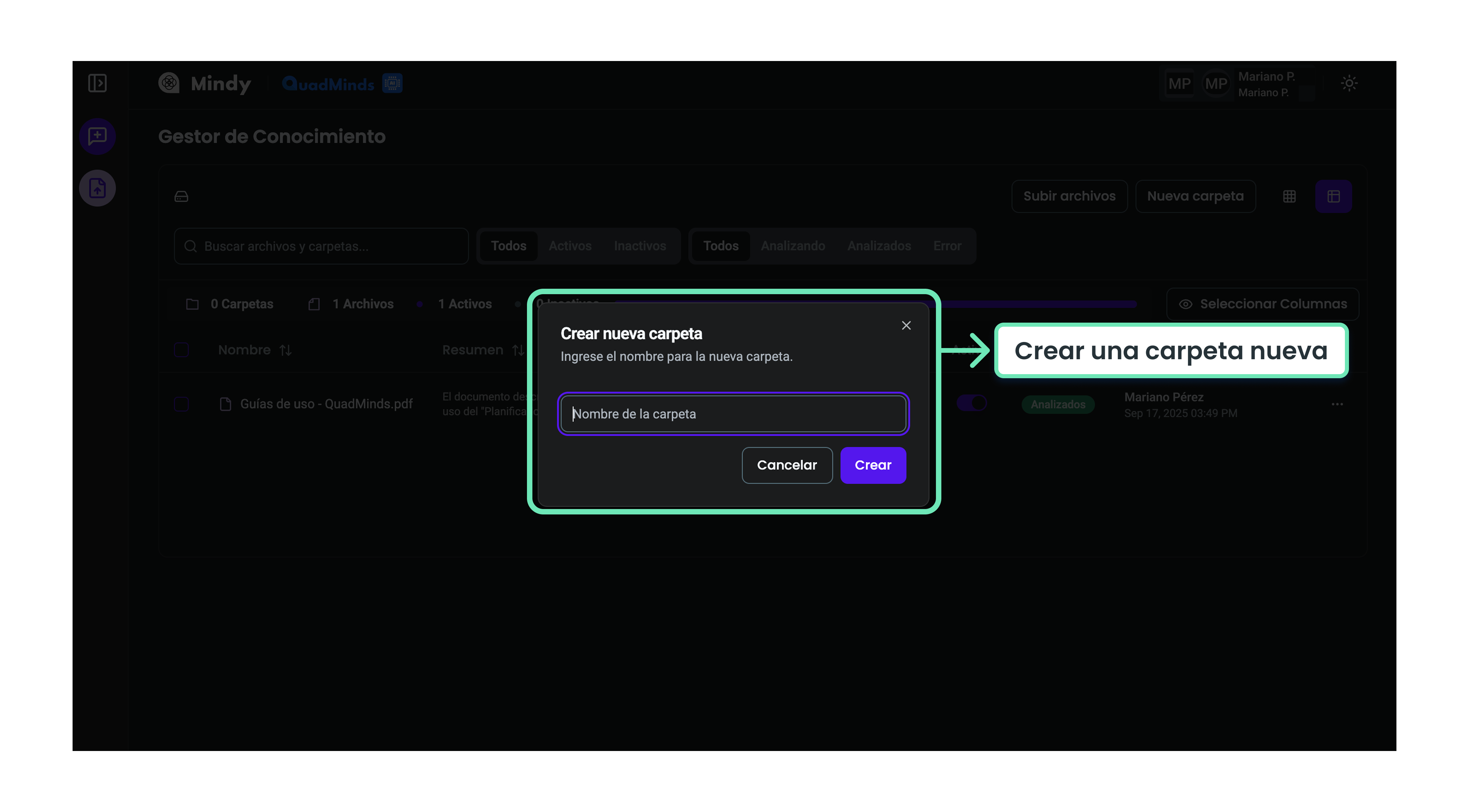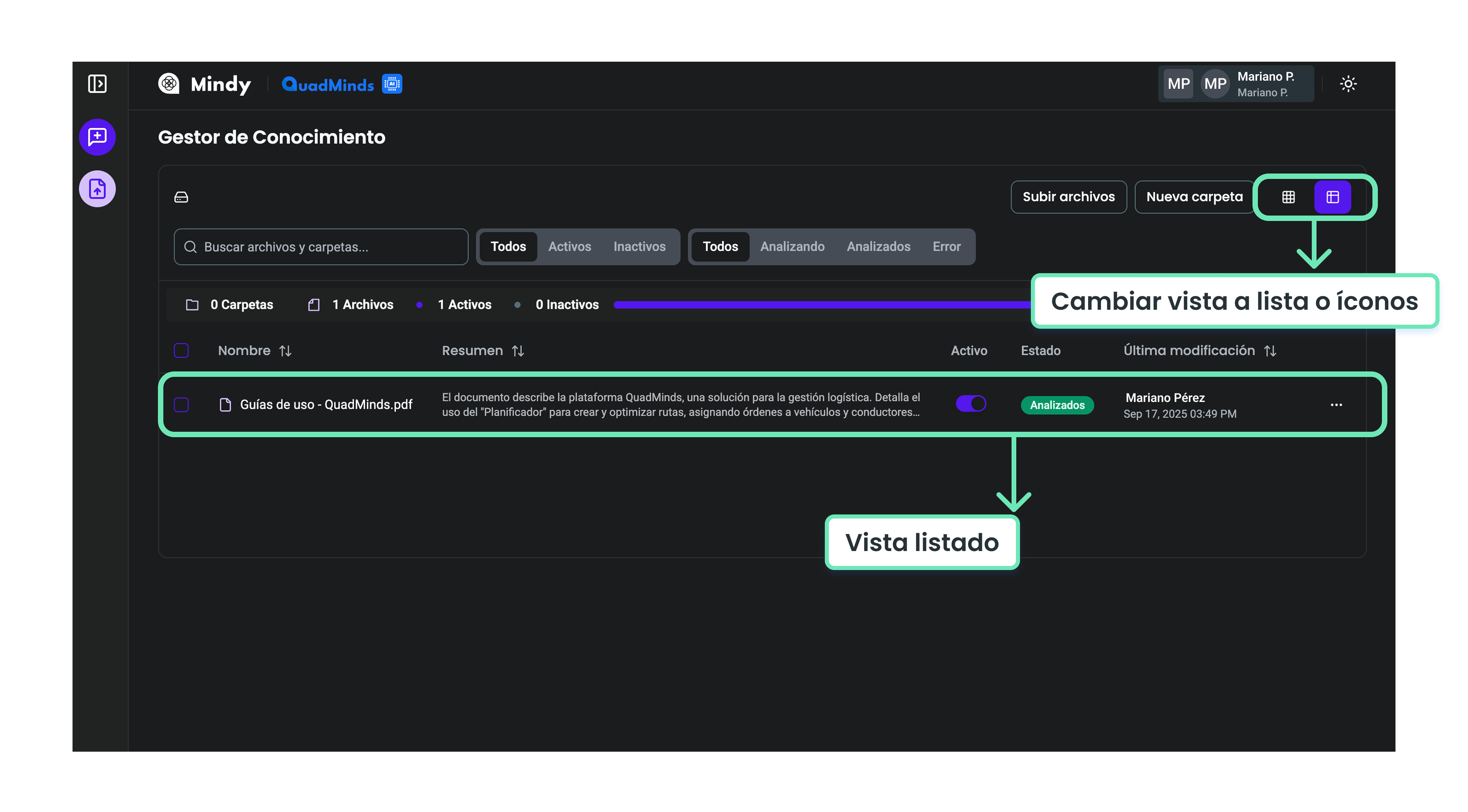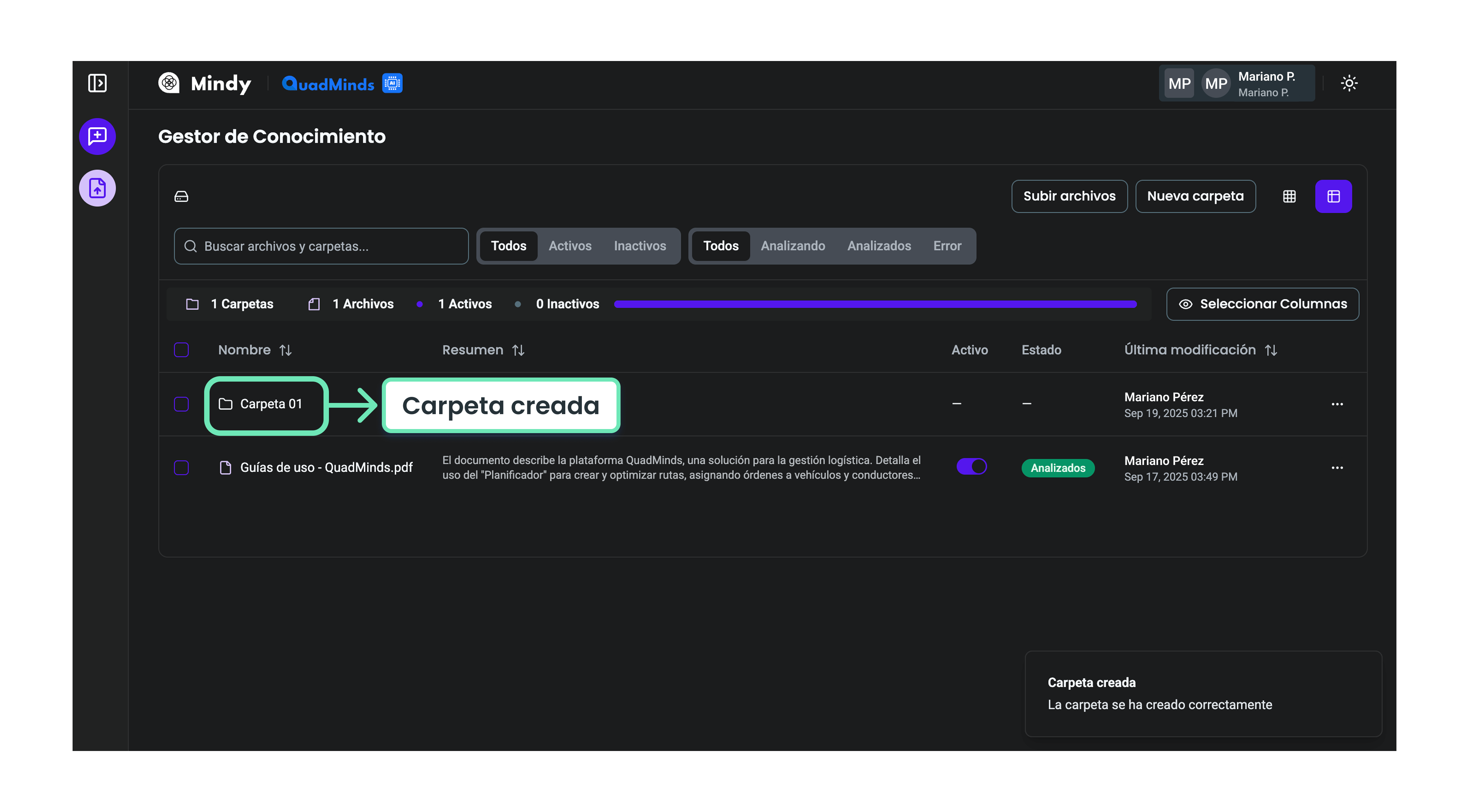 En la pantalla principal del Gestor de Conocimiento encontrarás una tabla que muestra las carpetas creadas y los archivos subidos a la plataforma.