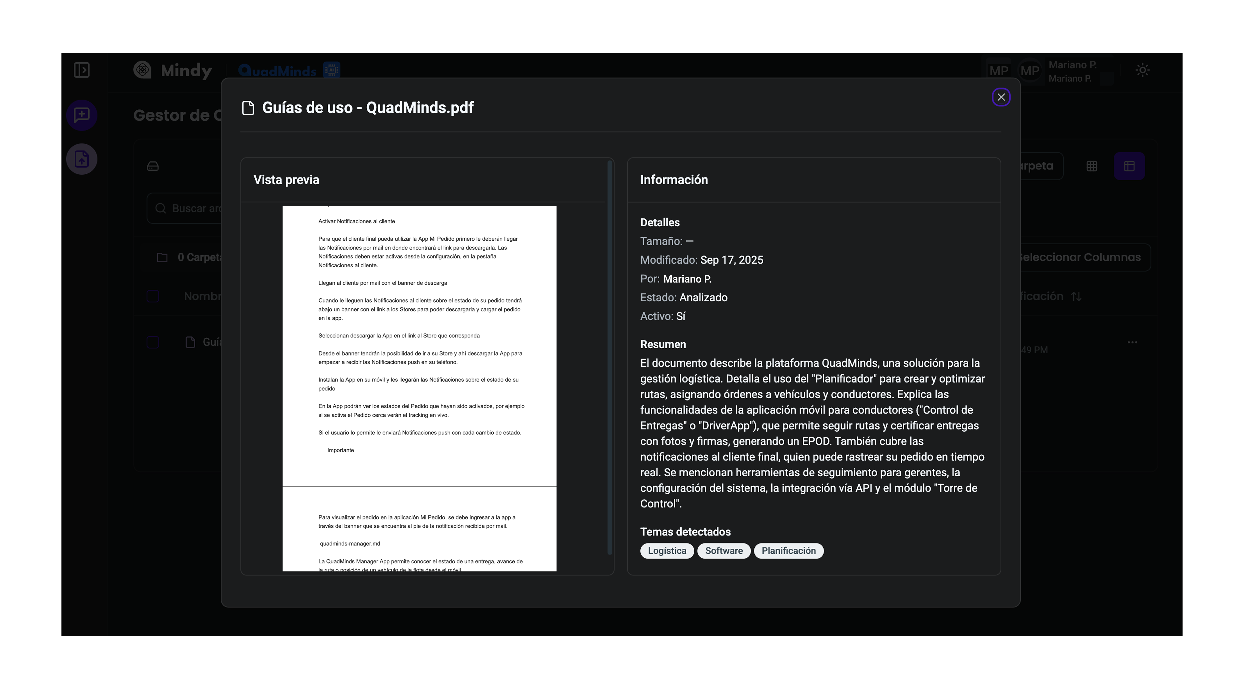 Al hacer click en el nombre de un archivo, ya sea en la vista de tabla o en la de íconos, podrás acceder a sus detalles.