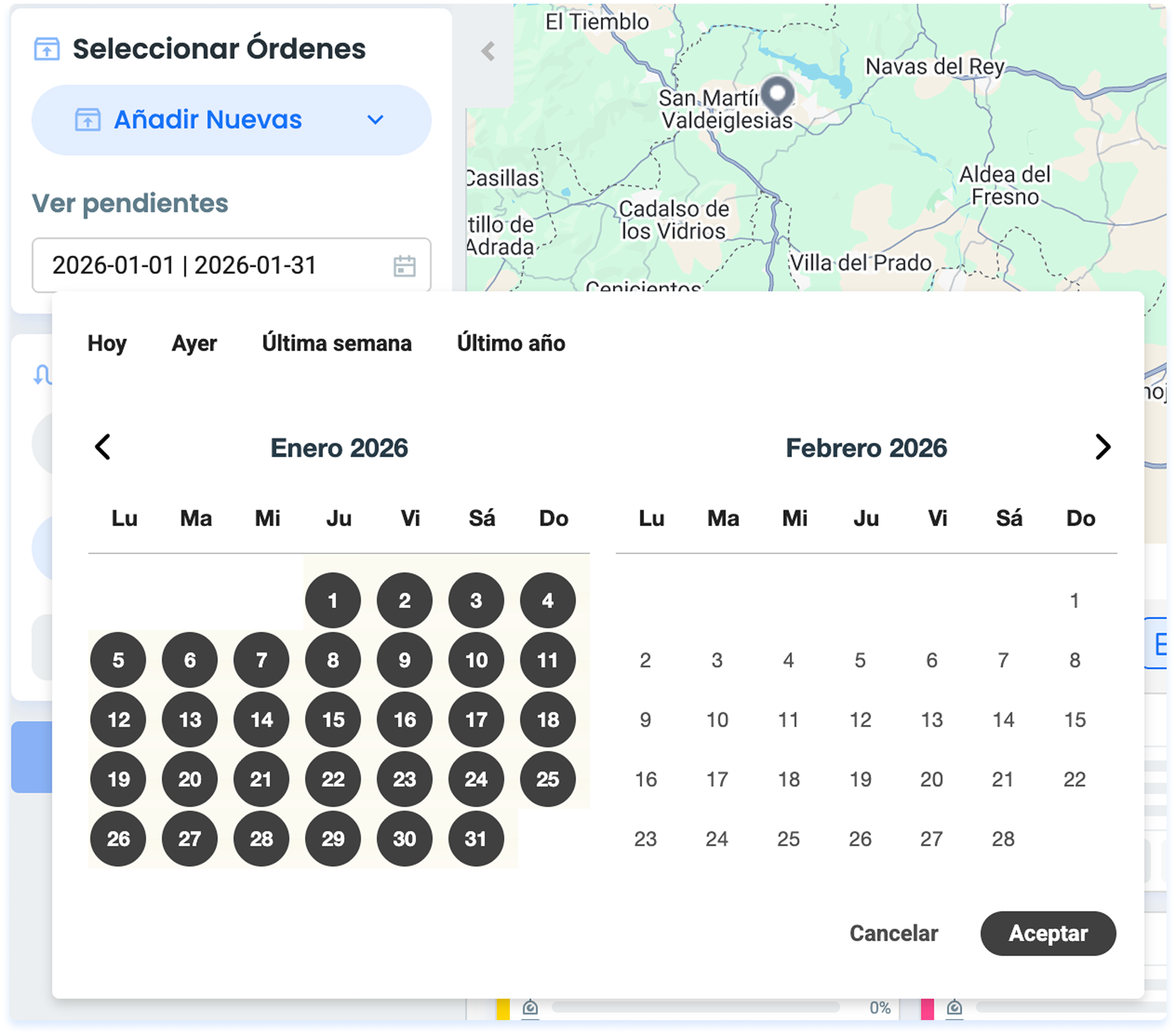 **La fecha que debes seleccionar es la fecha original de la orden, no la fecha de la ruta.**También puedes seleccionar un rango de fechas.