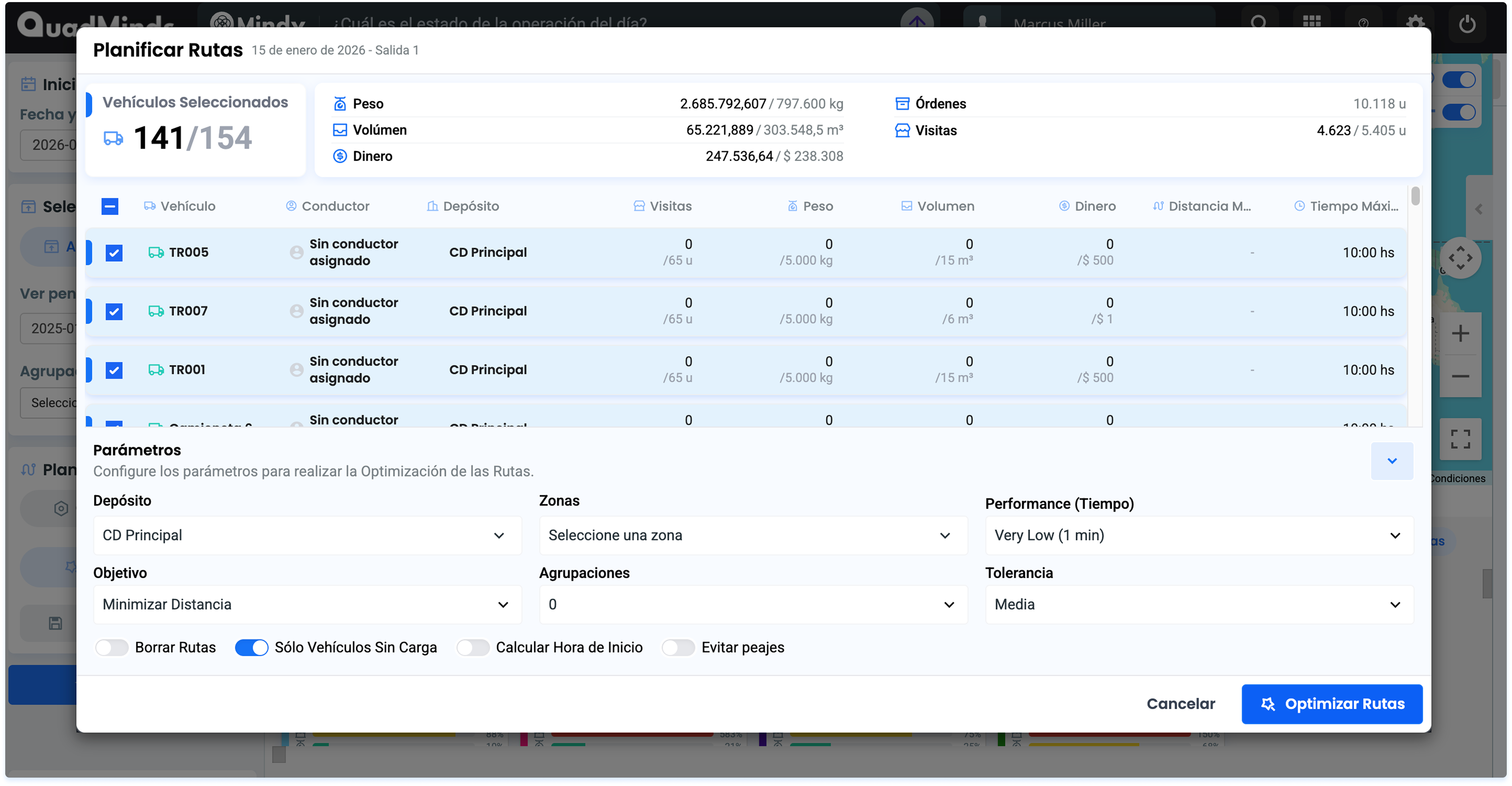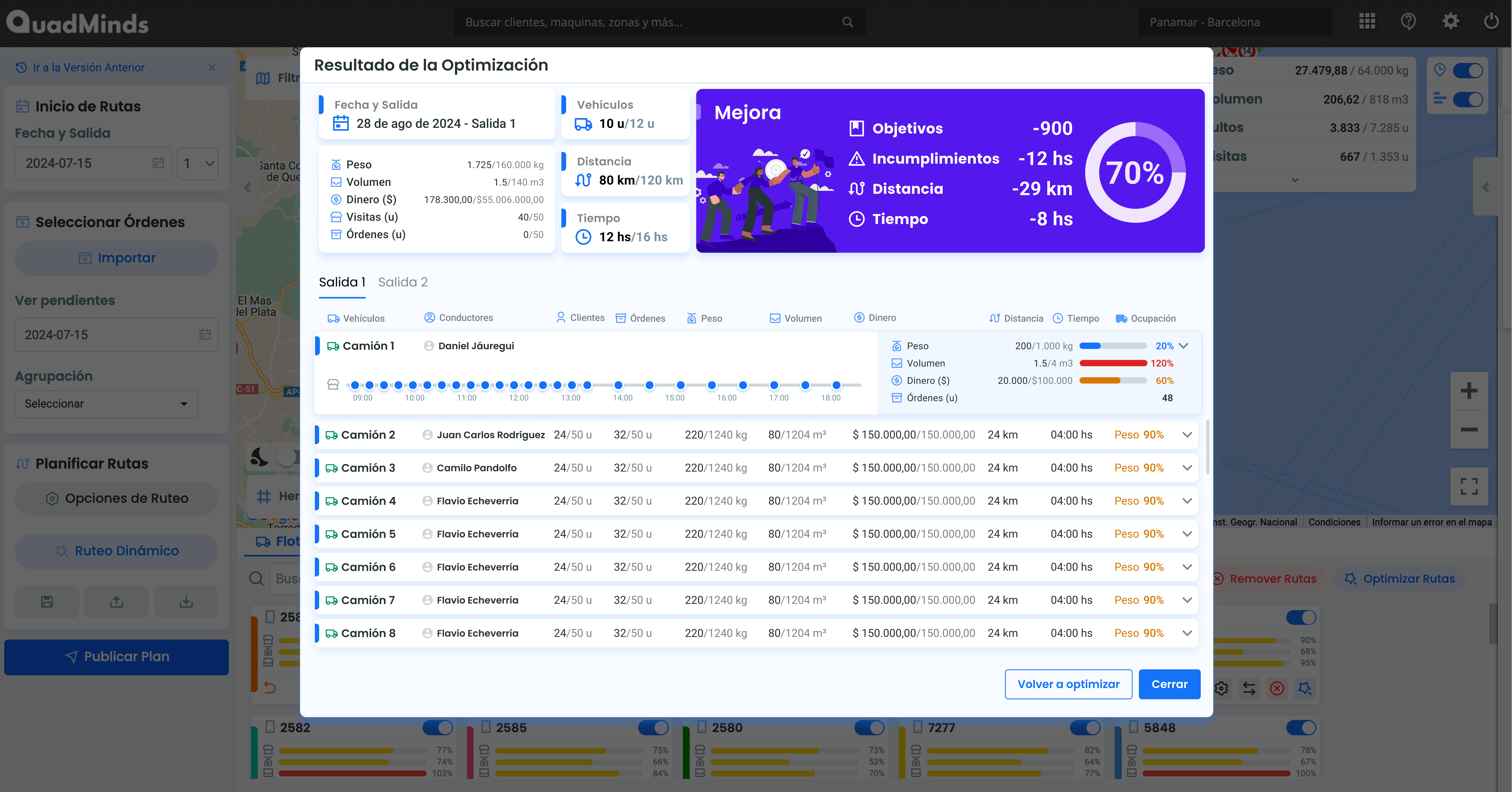 Al finalizar la optimización, los datos se mostrarán en pantalla. Se podrá presionar "ver resultados" y acceder a los planes de cada vehículo o volver a optimizar.