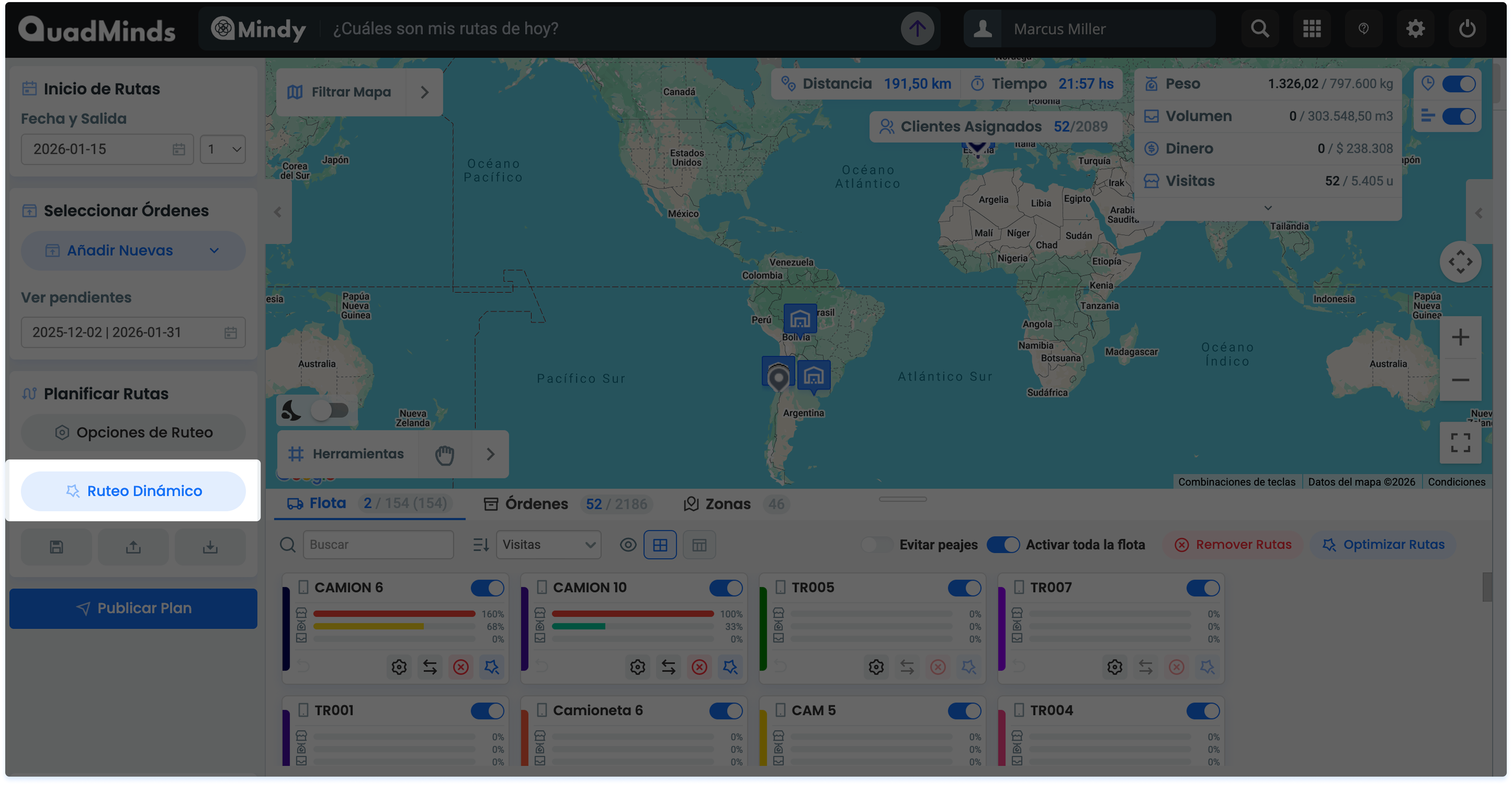 Al acceder a la pantalla de ruteo dinámico, el usuario dispondrá de todos sus vehículos, pudiendo seleccionarlos individualmente o en su totalidad.