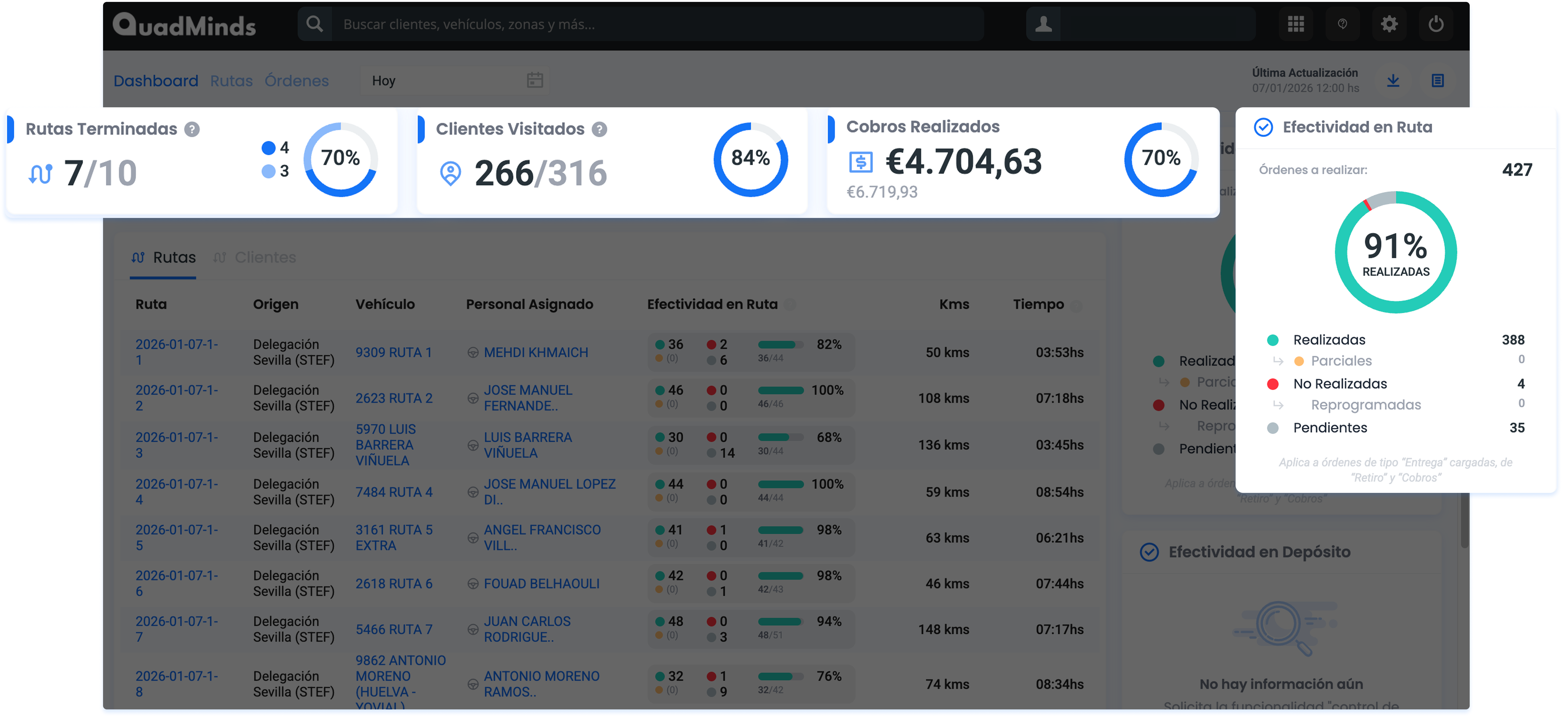 Además de los indicadores clave, en el dashboard vas a encontrar información general sobre el avance de las Rutas, las visitas a Clientes y el nivel de cumplimiento de las Órdenes, que representa la Efectividad de tus rutas.