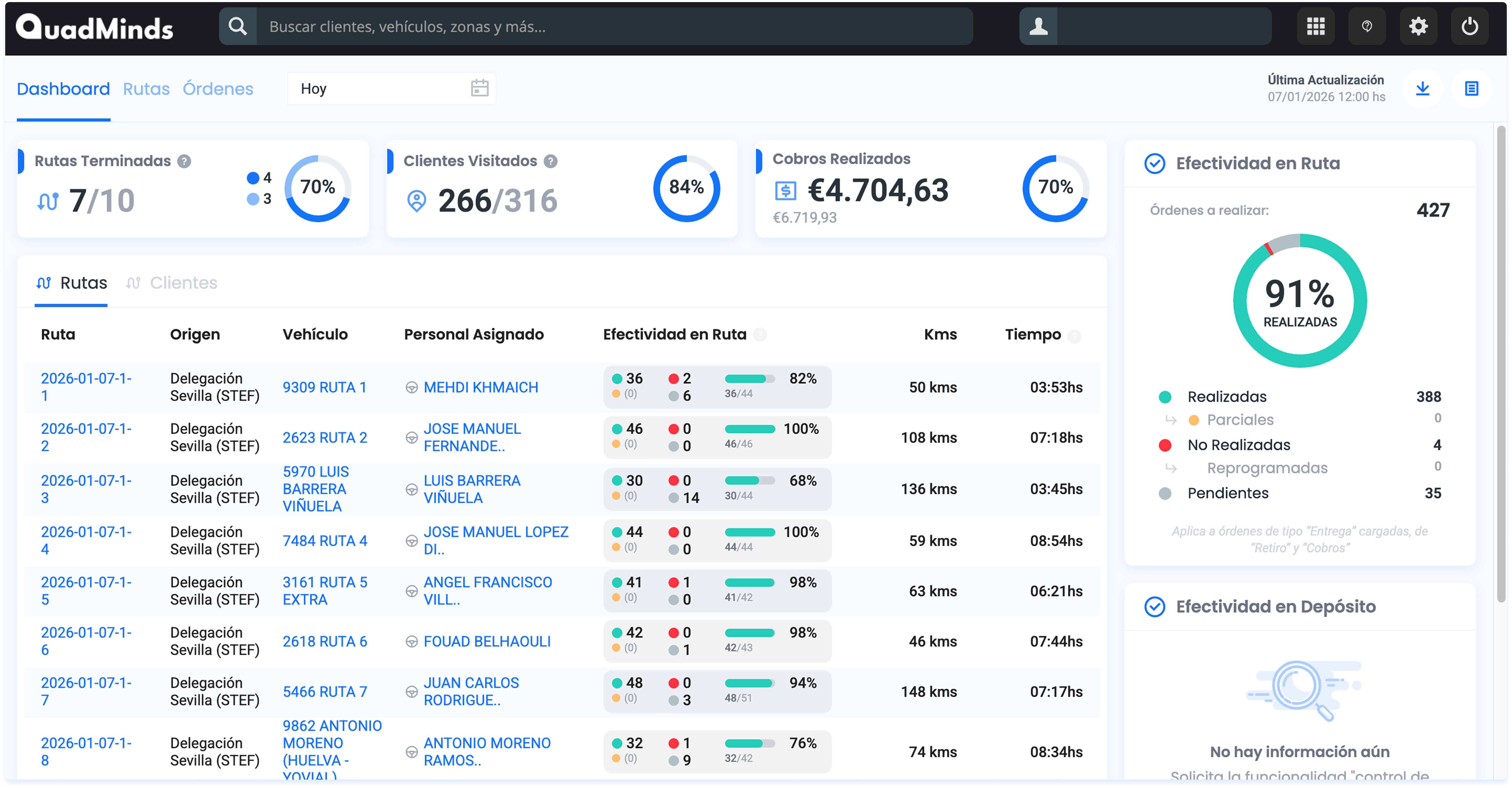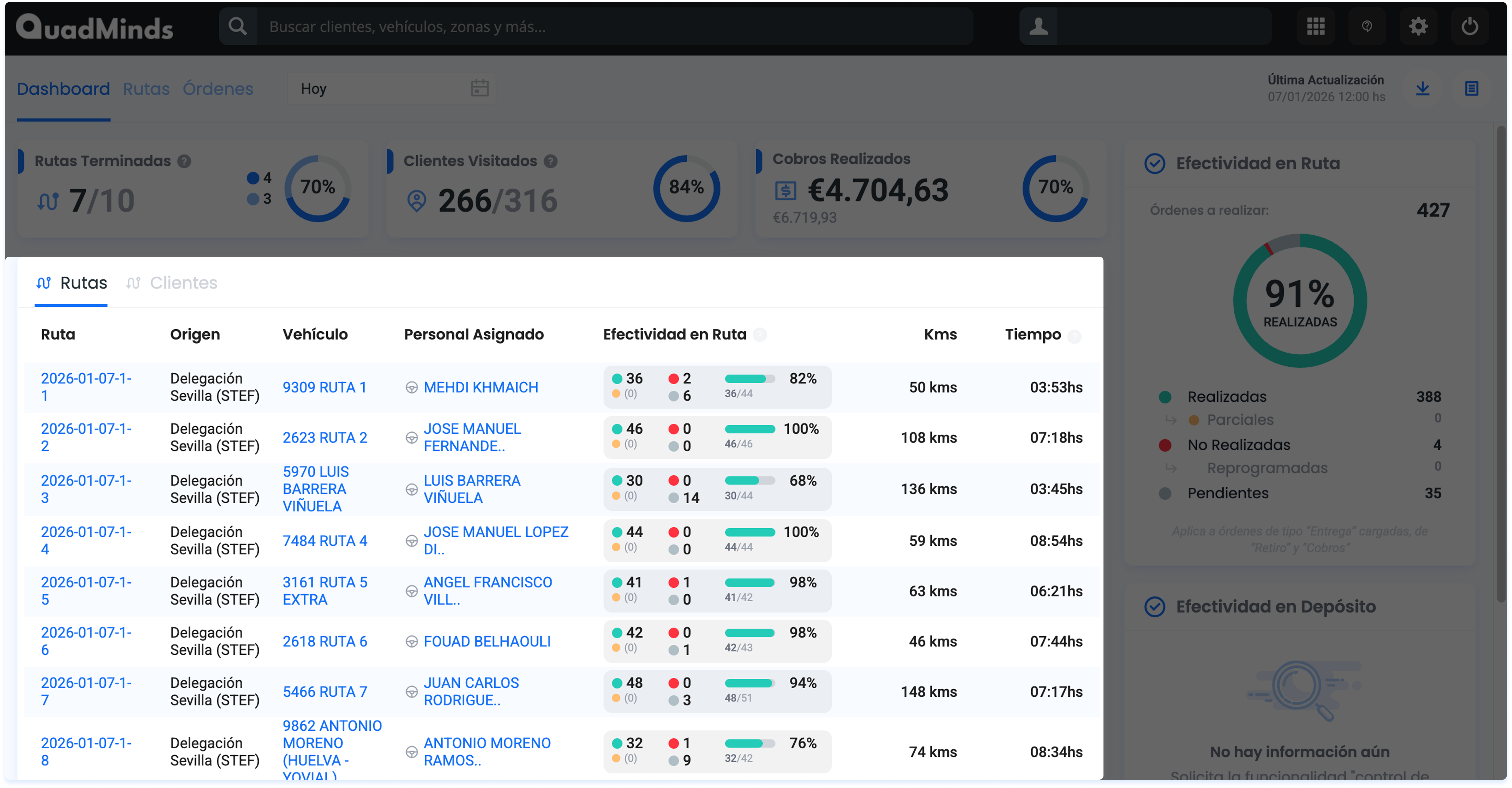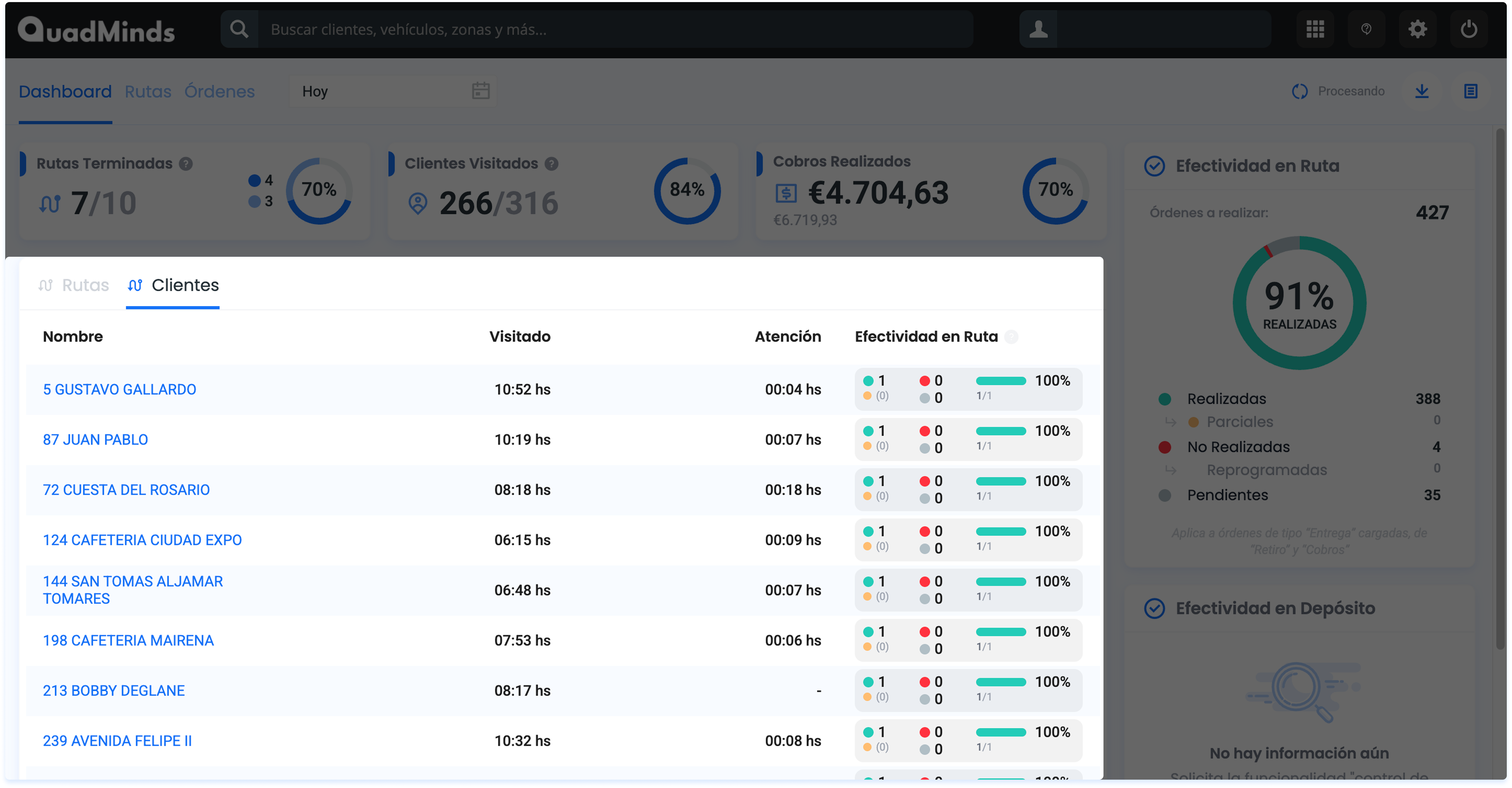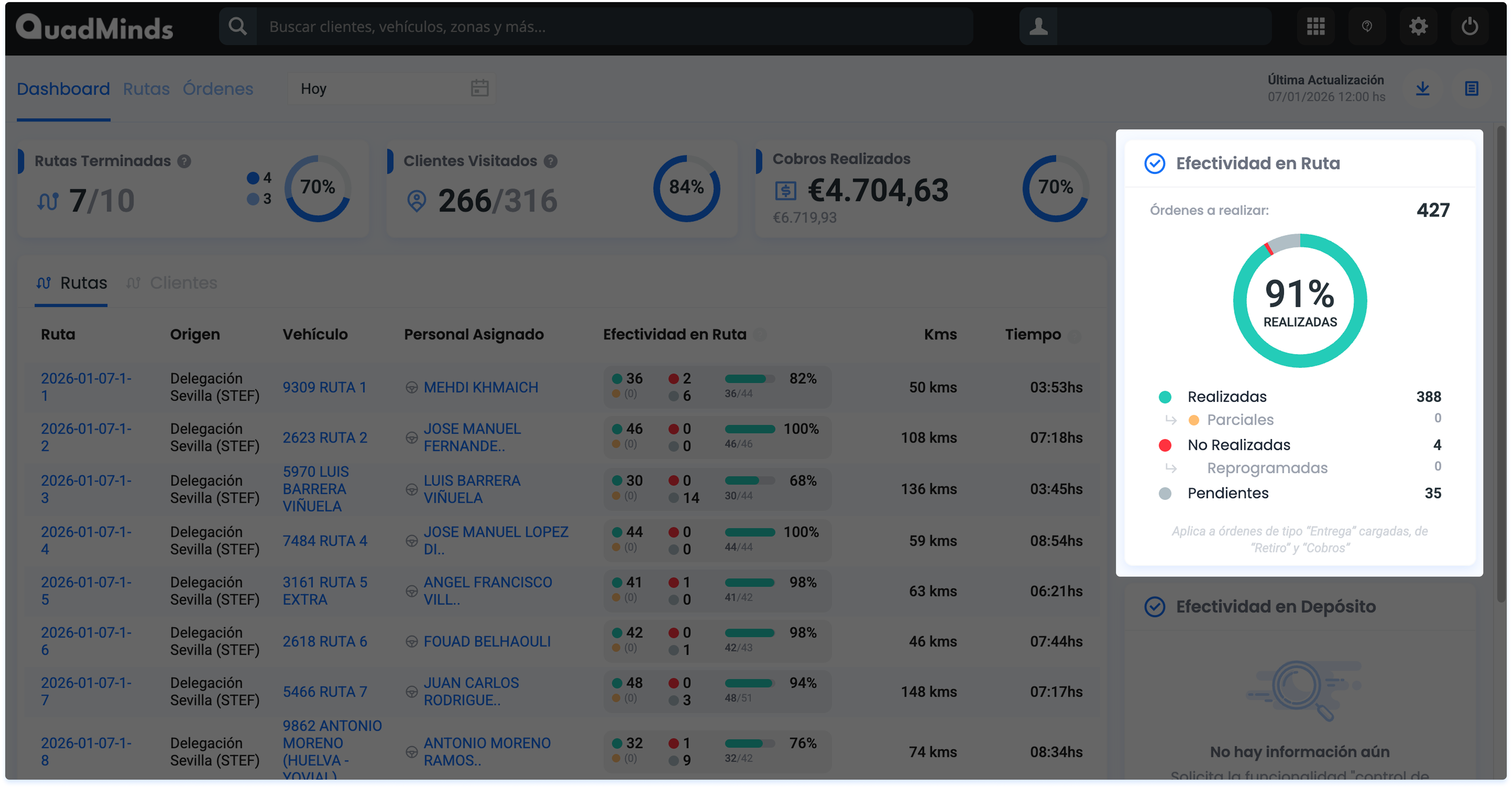 Vas a encontrar información general sobre el avance de las Rutas, las visitas a Clientes y el nivel de cumplimiento de las Órdenes (Efectividad)