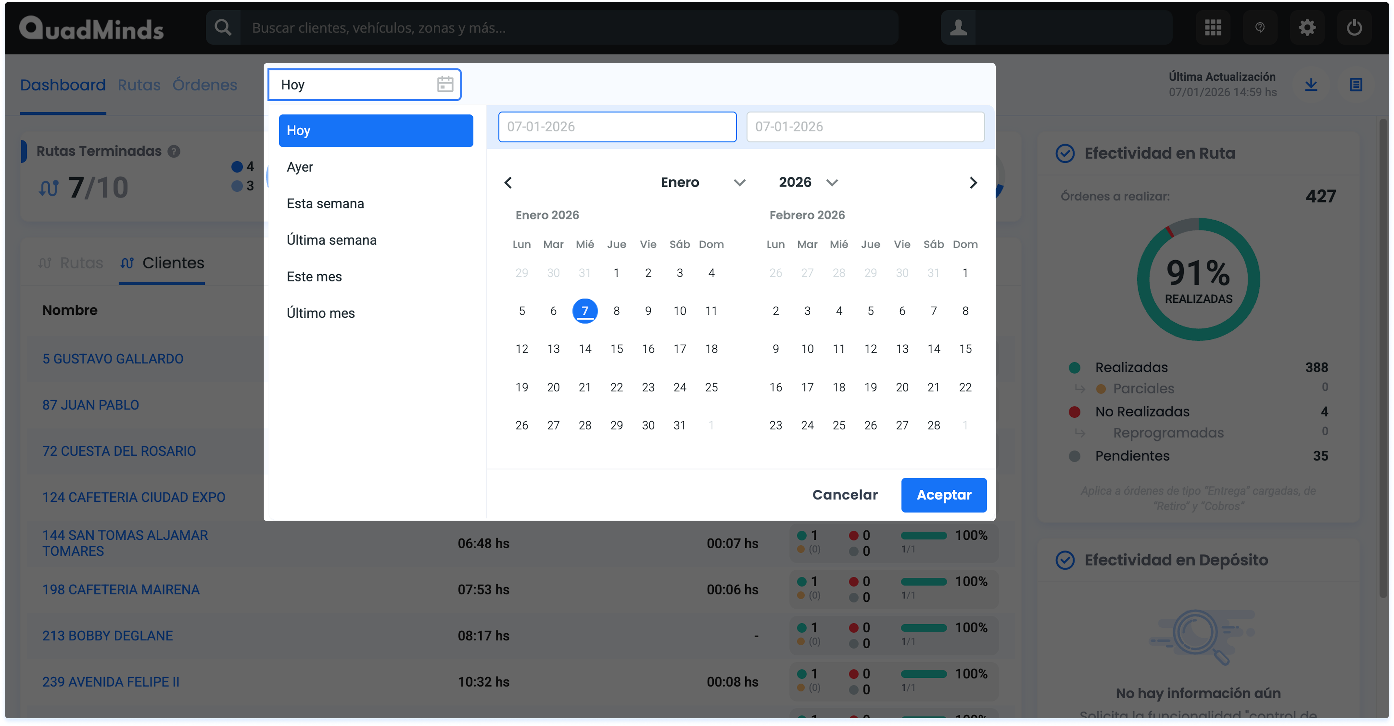 Para ver la Efectividad en fechas anteriores y/o períodos de tiempo específicos, desde el selector de fechas podrás elegir una fecha puntual, un rango de fechas específico o los rangos de fechas predeterminados para que la información del indicador Efectividad y de los listados Rutas y Clientes, se actualice.