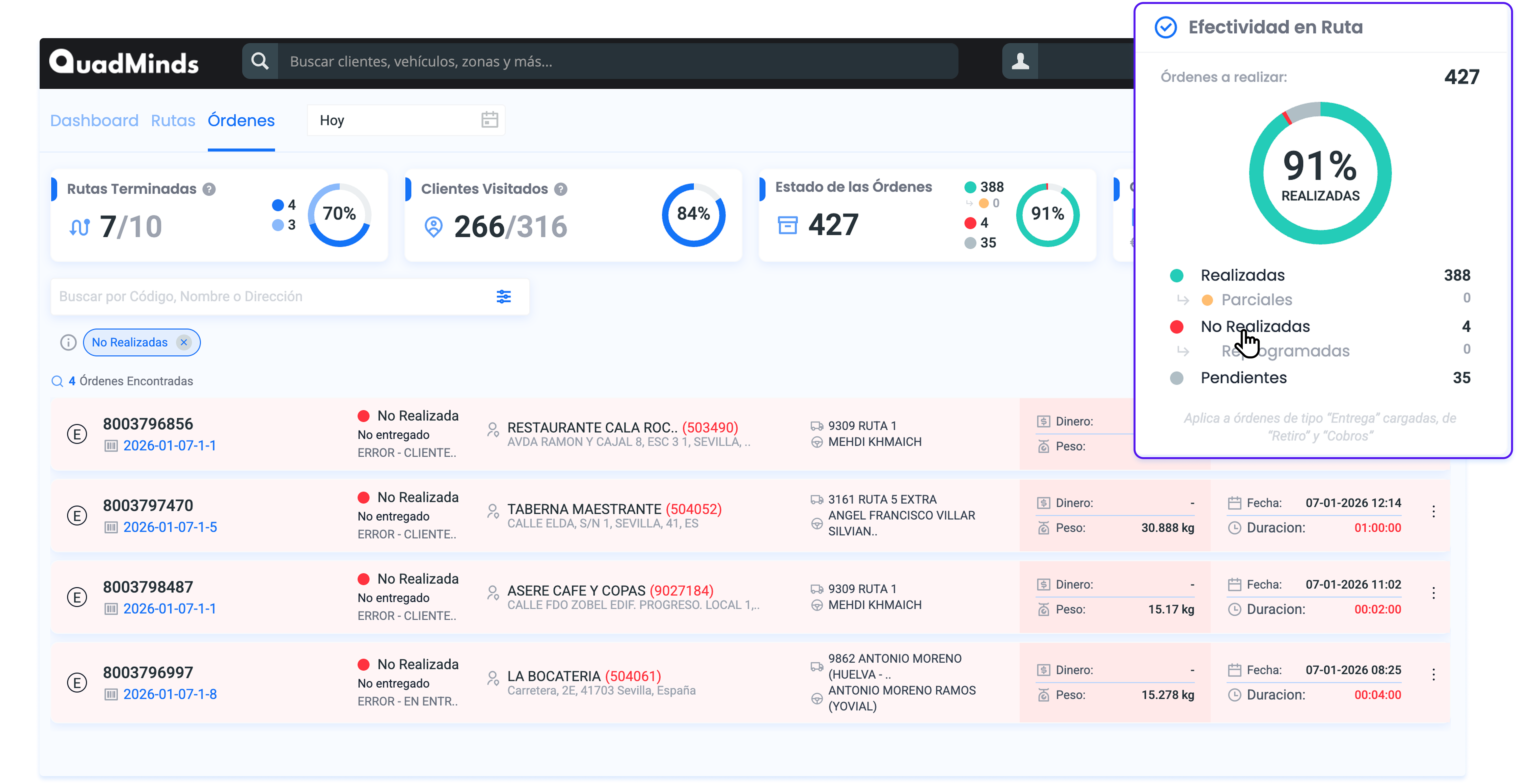 - La Efectividad de cada Ruta: Es el porcentaje de Órdenes con estado "Realizada" sobre el total de Órdenes de la Ruta.