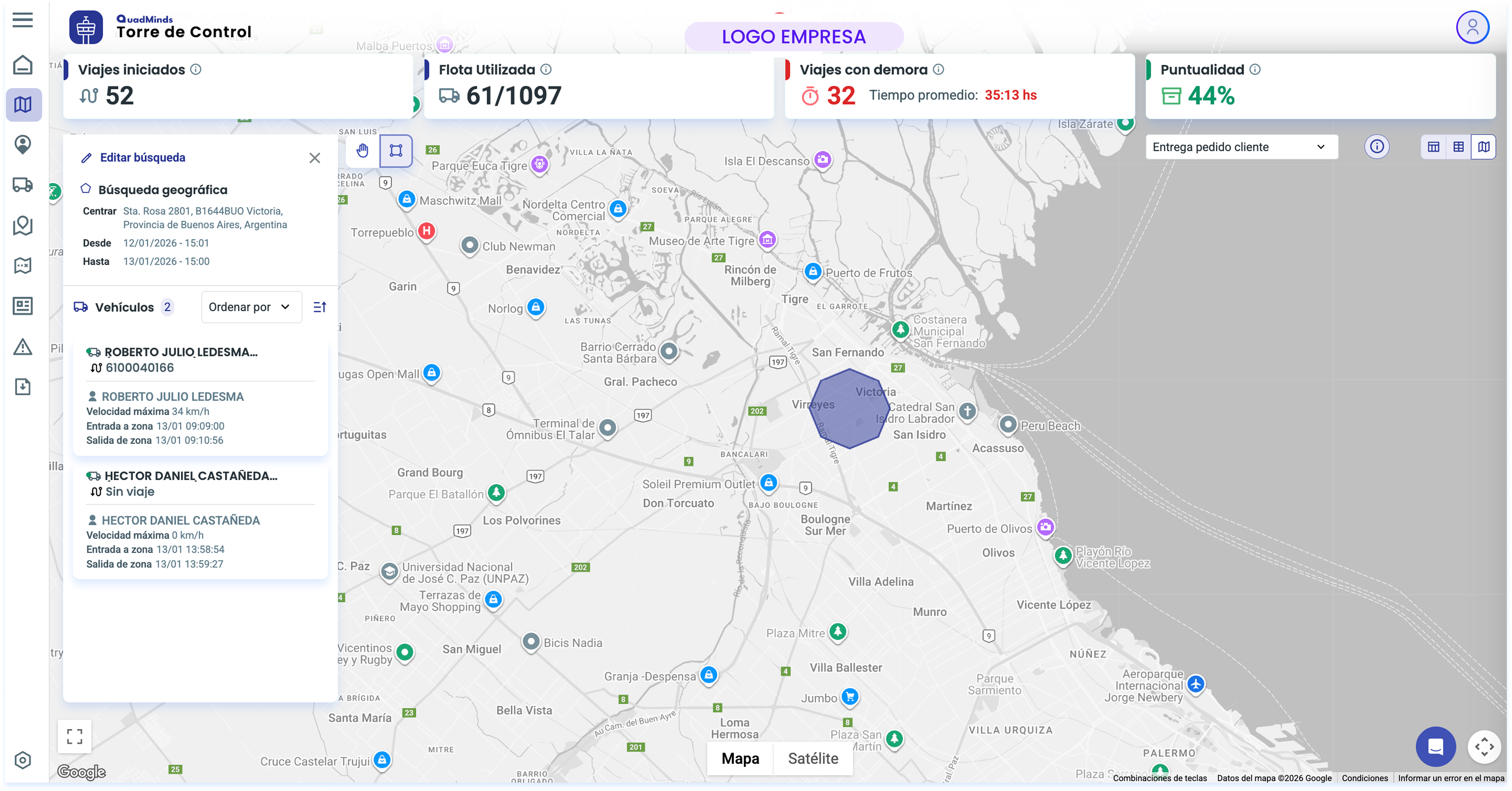 Busca una dirección de referencia en el mapa, dibuja un polígono y selecciona una fecha desde y otra hasta cuando para que aparezcan los recorridos de los viajes que pasaron por ahí.