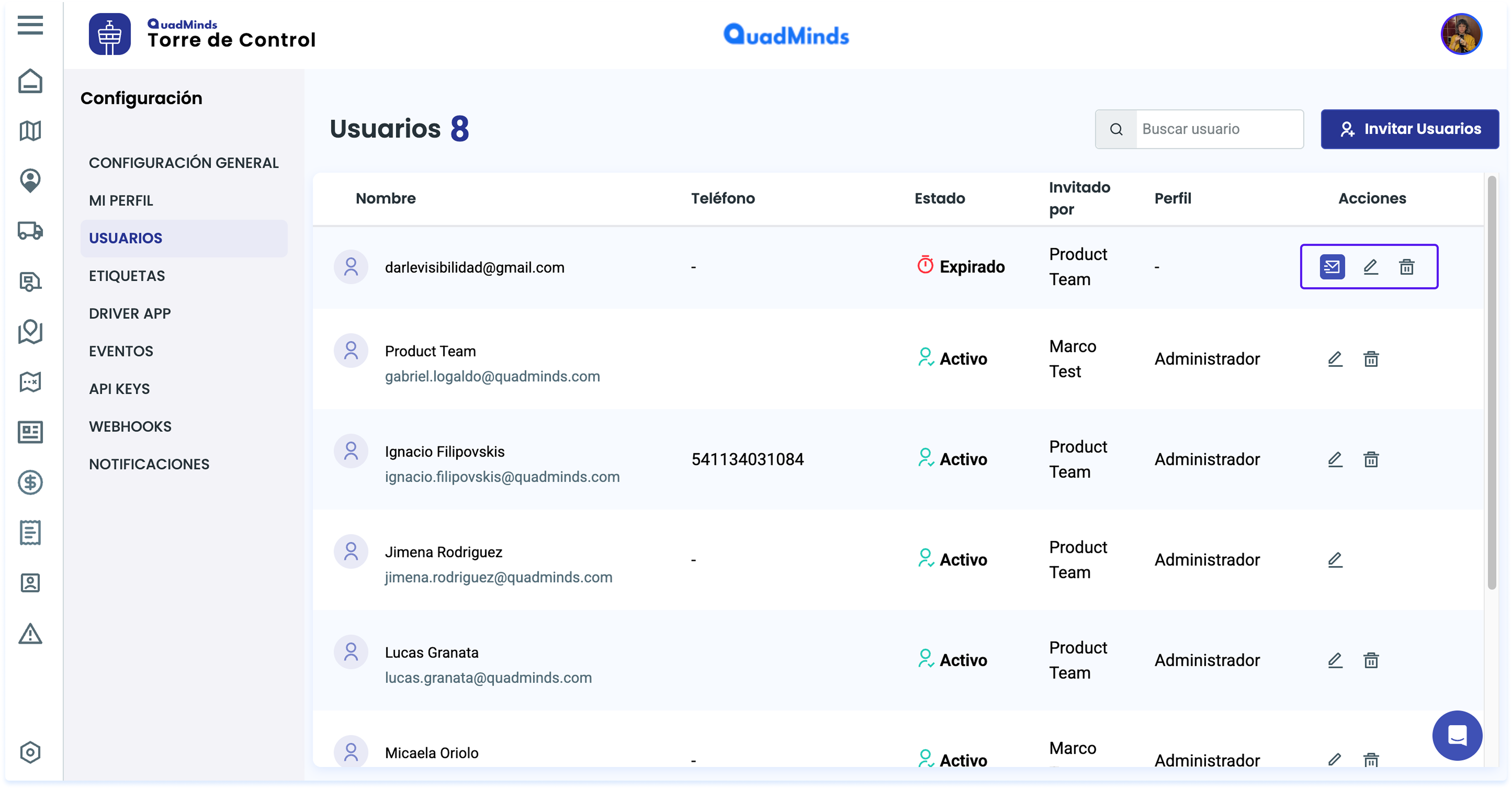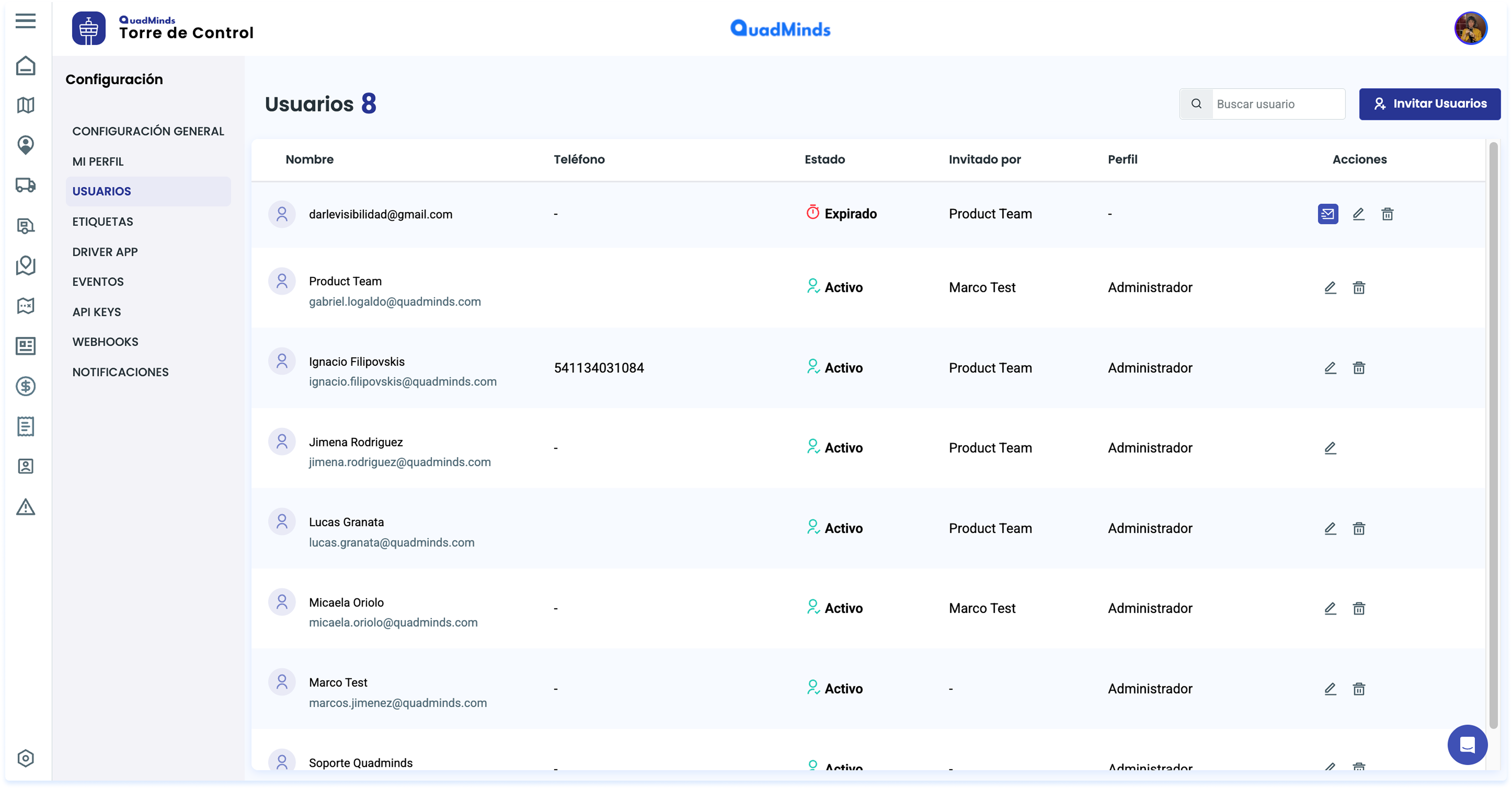 En la tabla de Usuarios vemos la información necesaria de los Usuarios de la Torre y el estado de su invitación, los permisos que tienen para editar o ver y acciones a tomar.
