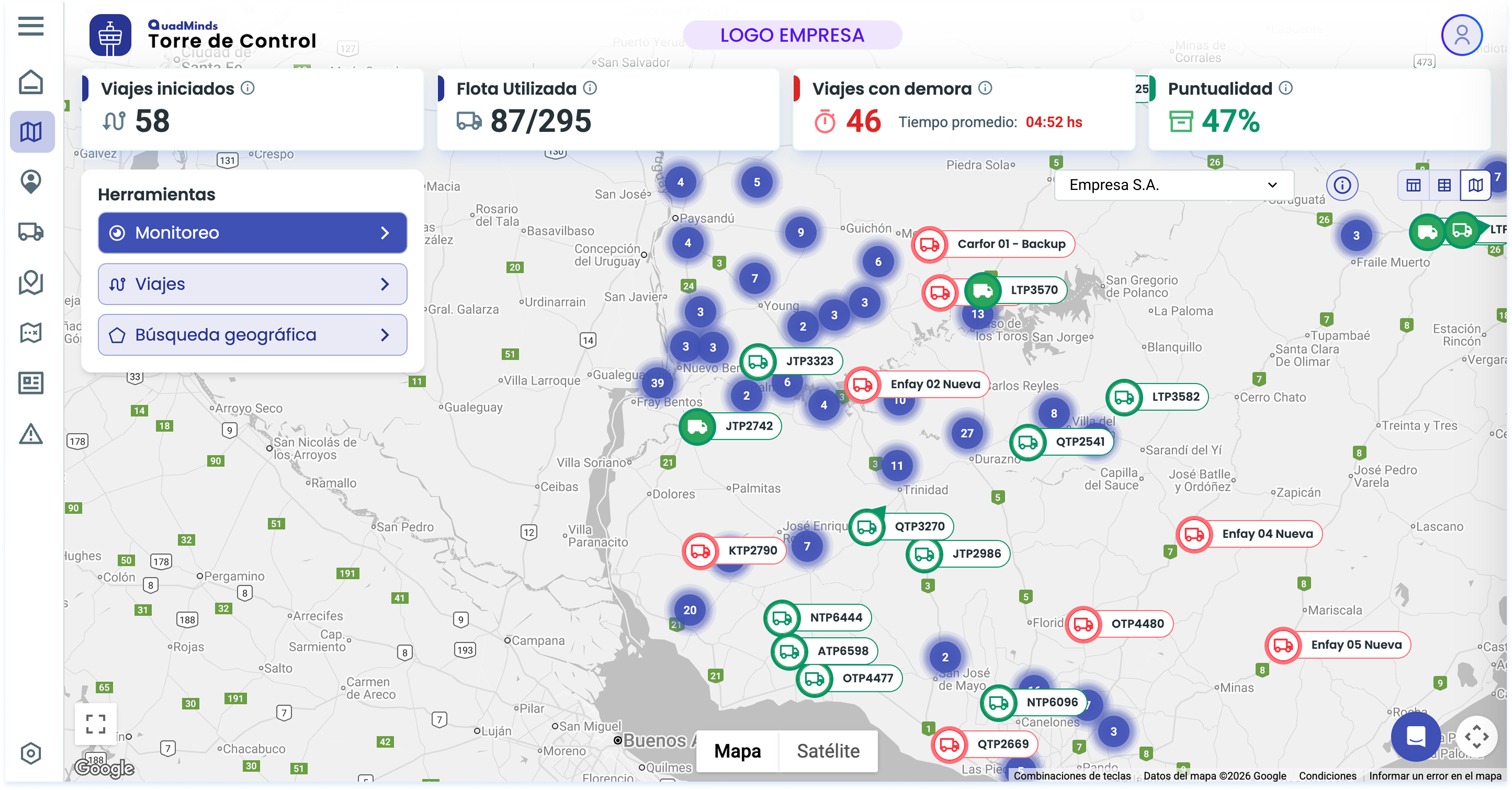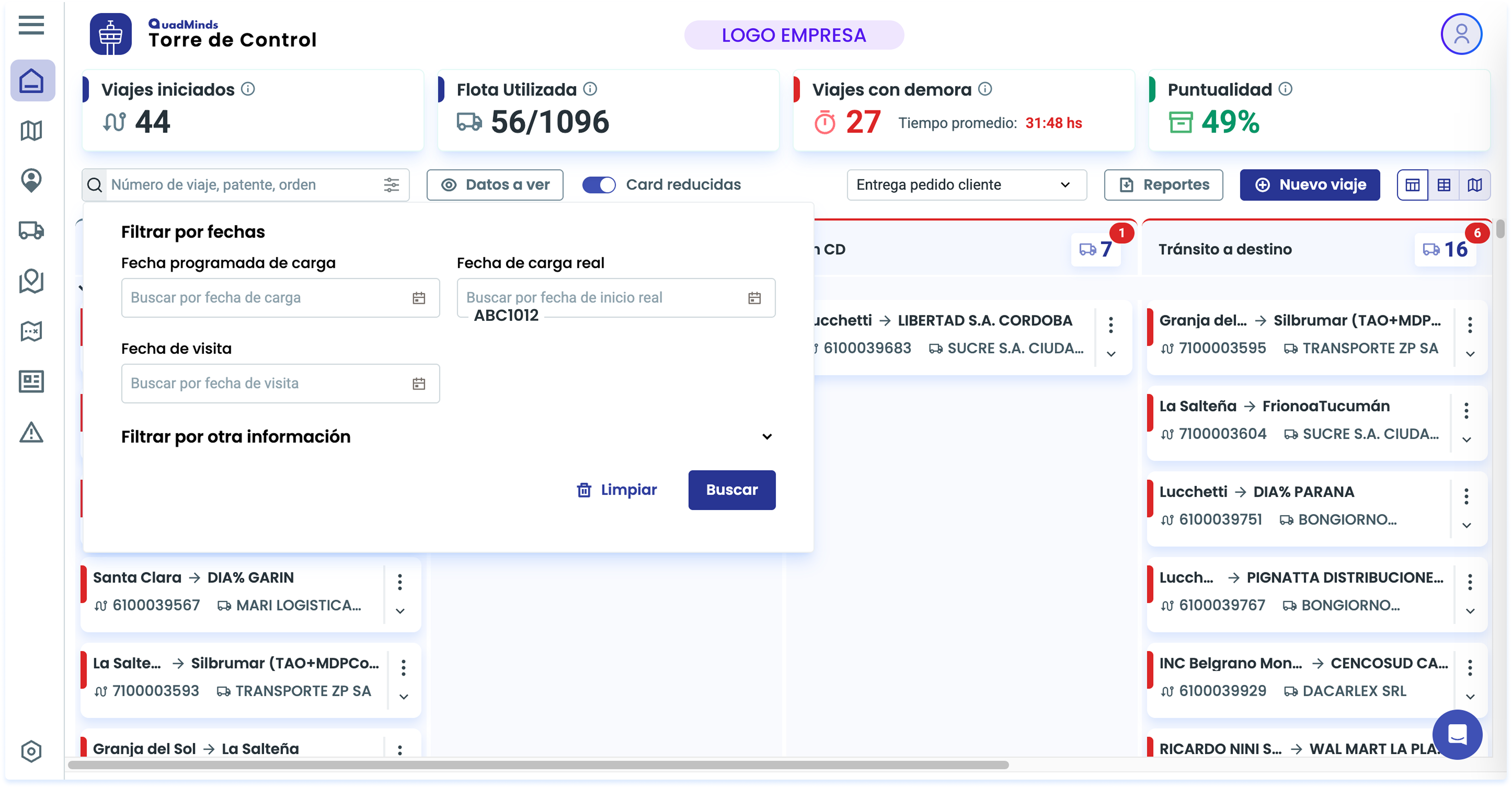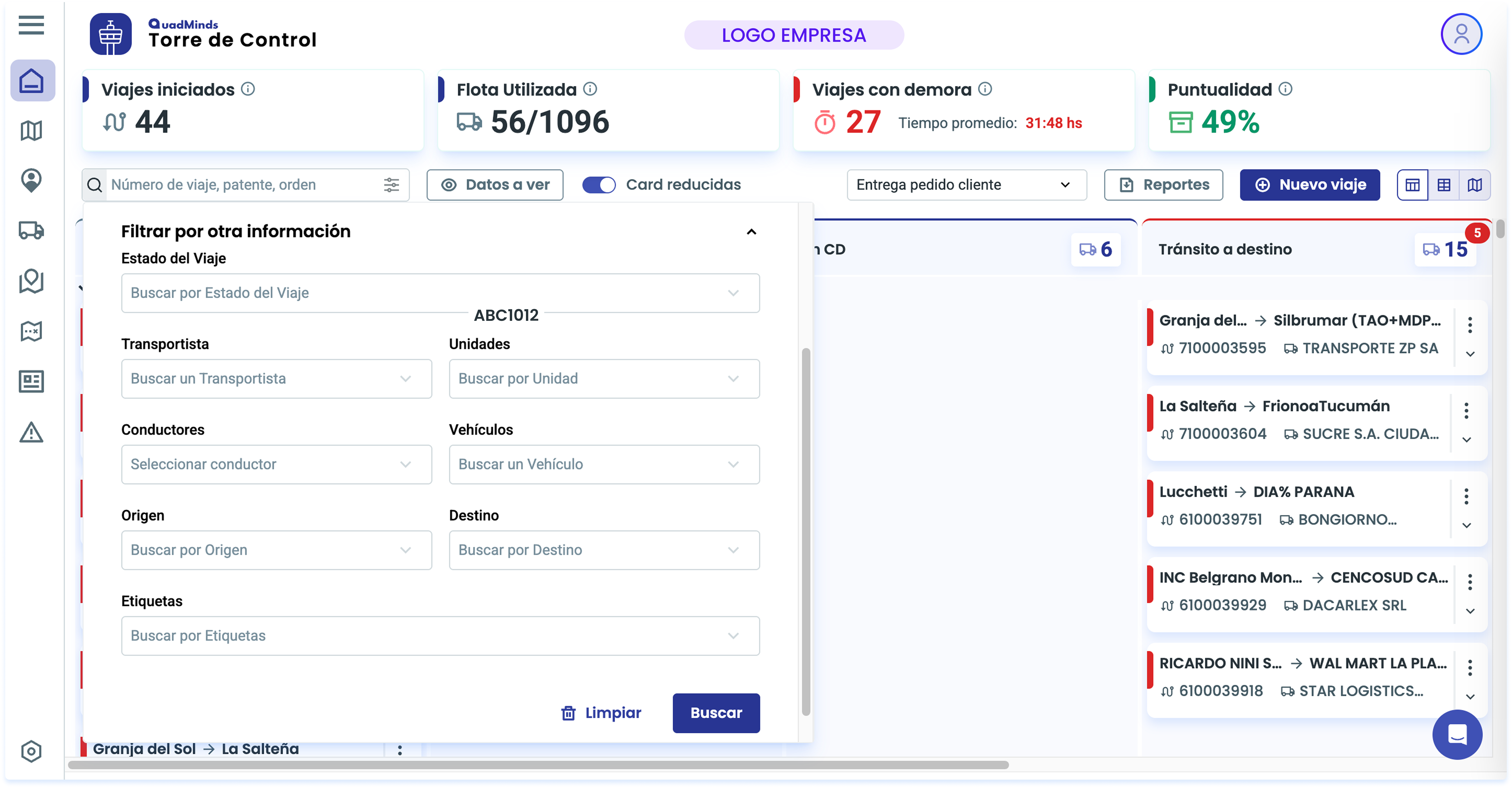 Se puede buscar por Código de Viaje, Patente, o se pueden aplicar filtros avanzados.