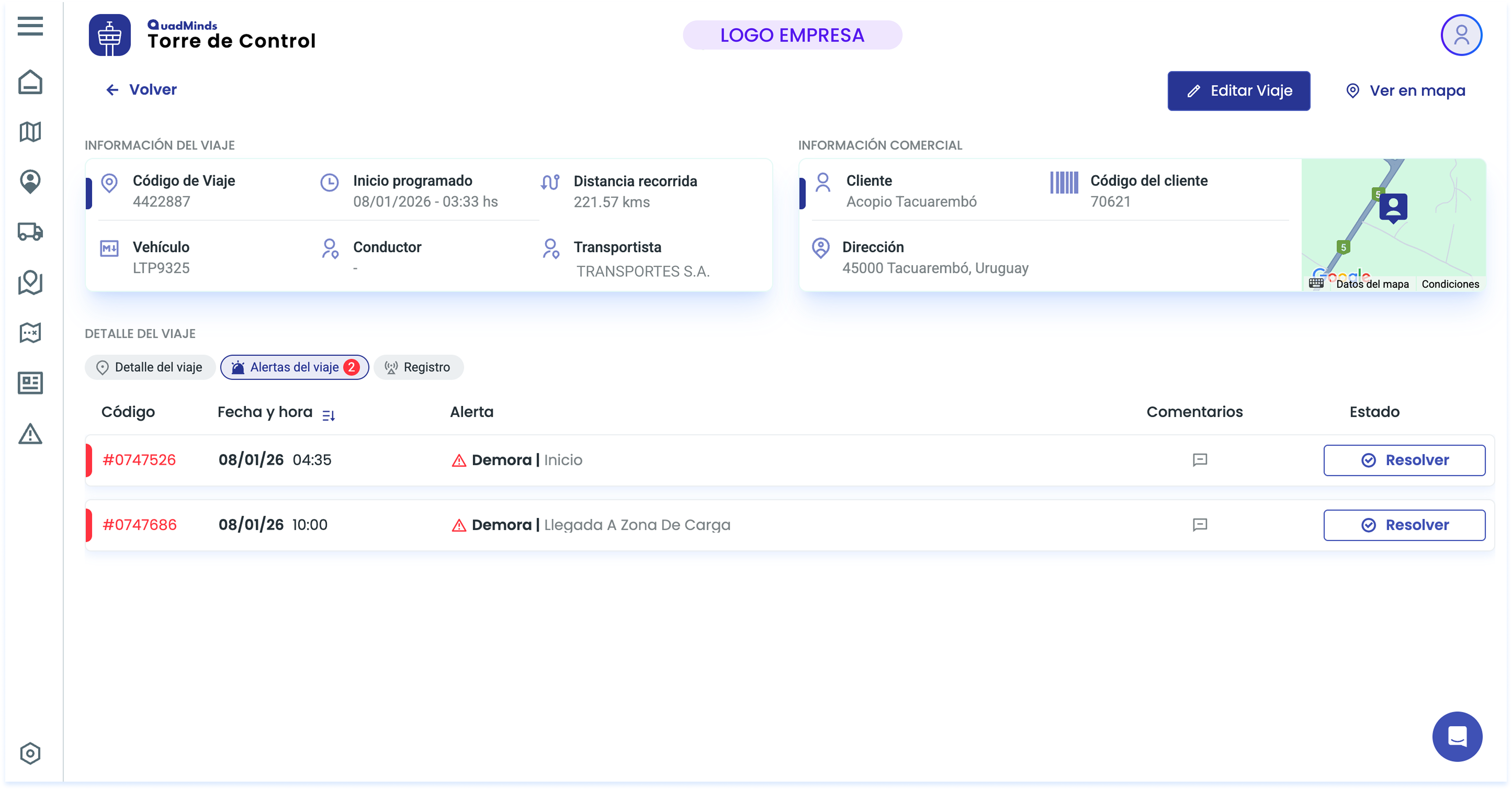 Dentro del detalle del Viaje se pueden ver las Alertas del mismo