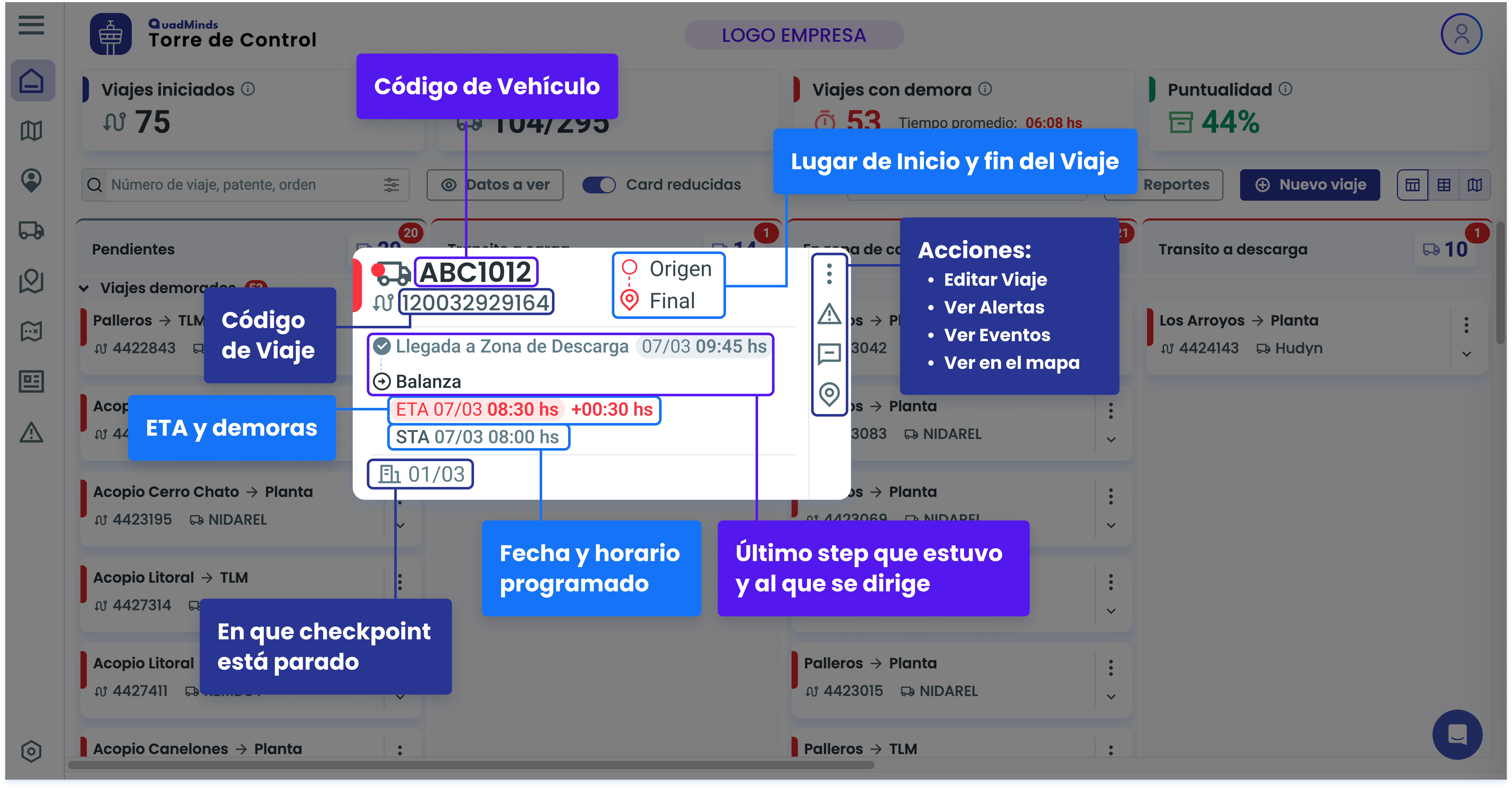 Las cards que vemos en el kanban representan un Viaje, cada una con la información sobre el mismo. El código de Viaje, el código de Vehículo, Desde donde sale y el destino, en qué instancia del viaje está y las acciones para editar, ver alertas, ver registro del viaje y verlo en el mapa.