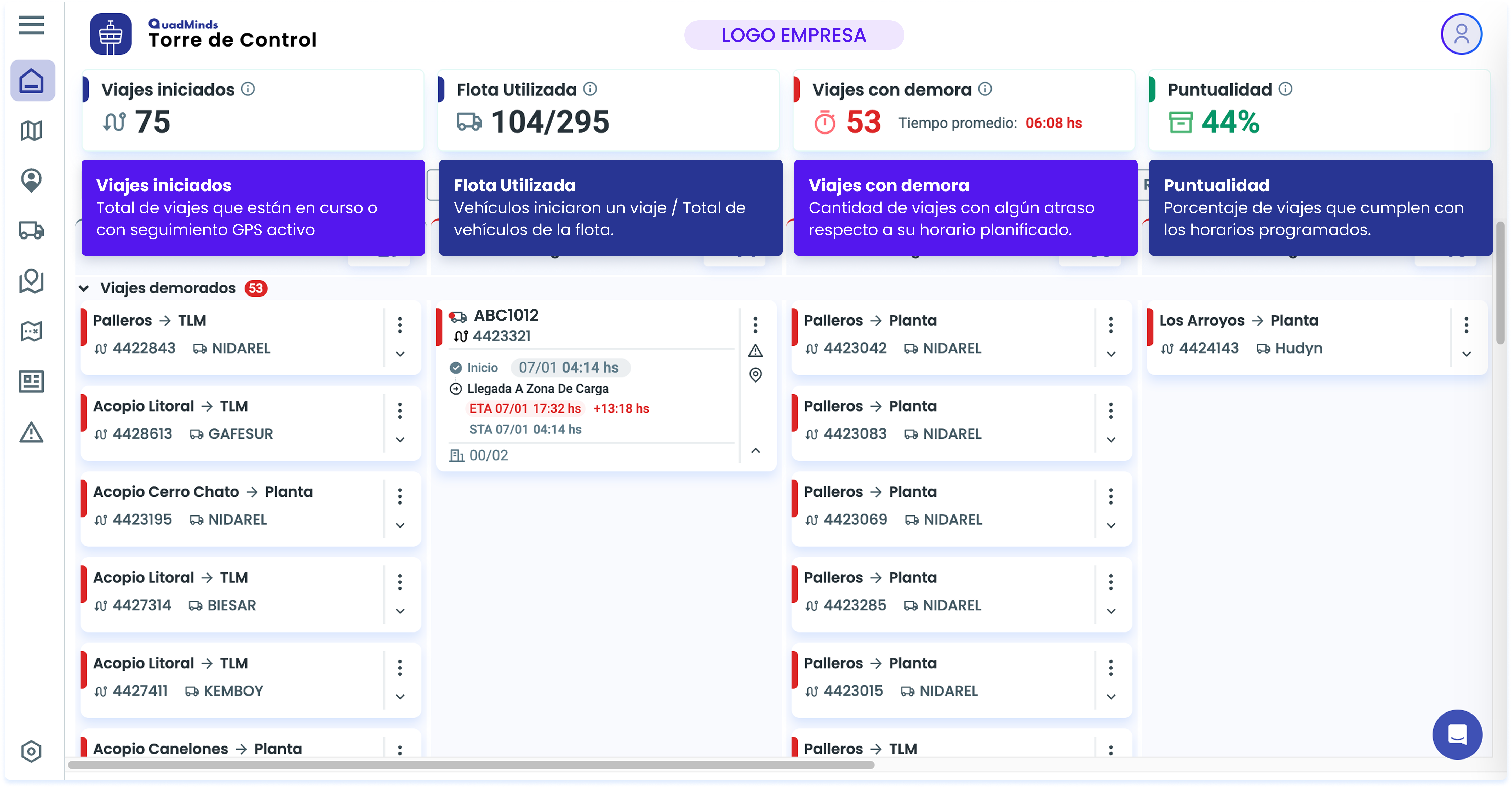 Al ingresar a la Torre vemos la Vista kanban para seguir los viajes en curso, también hay posibilidad de ver los Viajes en una Vista tabla o en el Mapa en tiempo real.